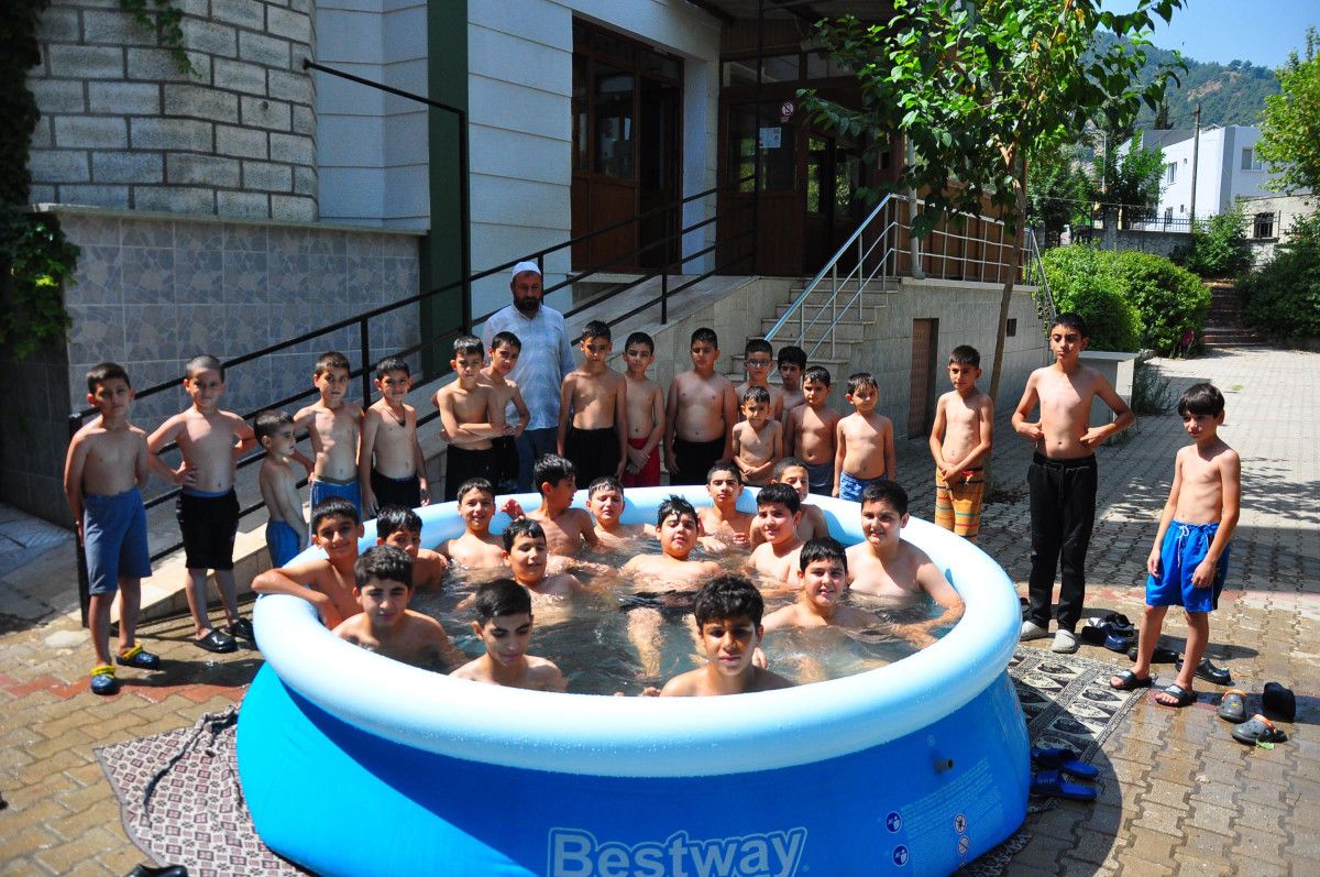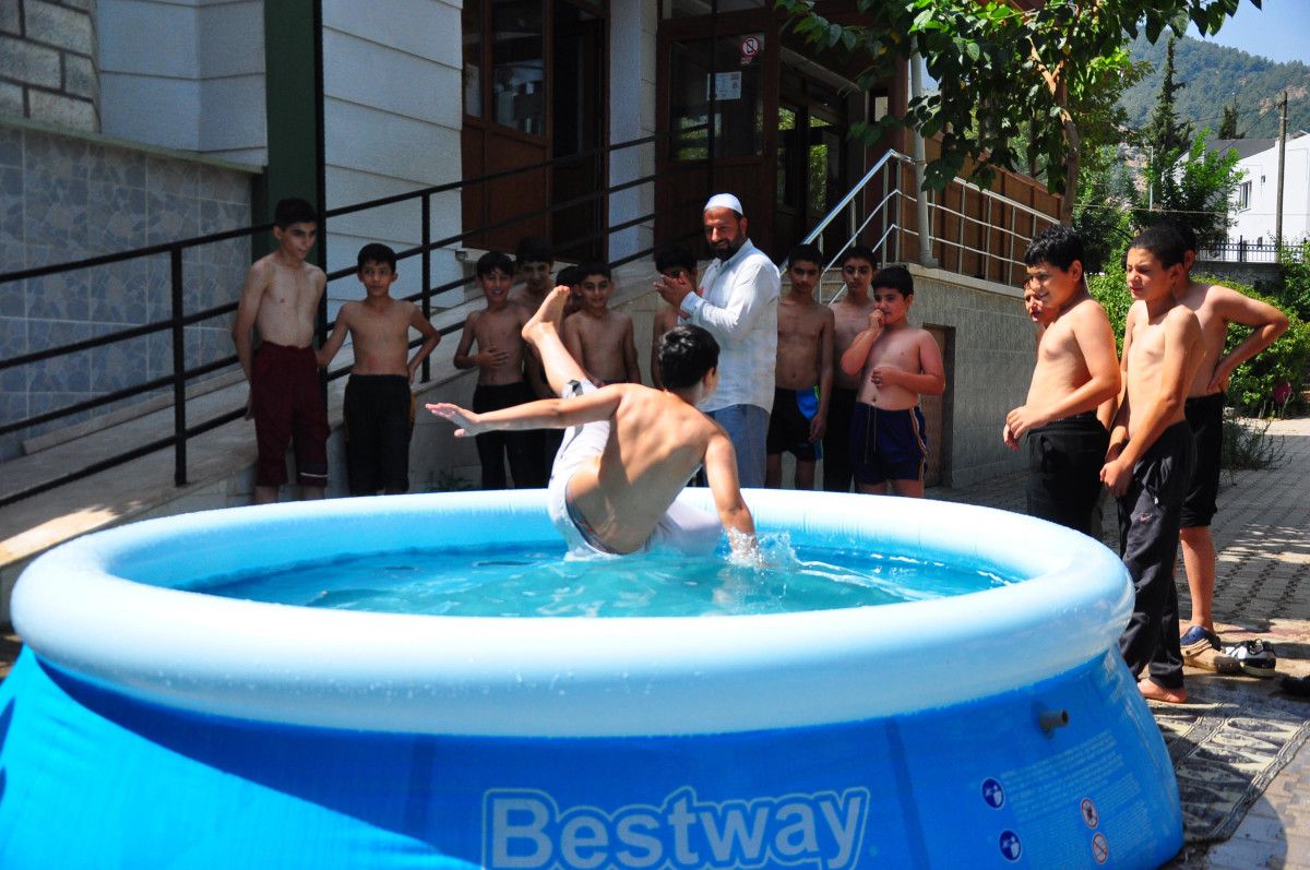 Yaz Kur’an kursuna katılan 110 öğrenci, öğlen saatlerinde derslerini tamamladıktan sonra sırayla havuza girerek hem serinliyor hem de eğlenceli vakit geçiriyor.