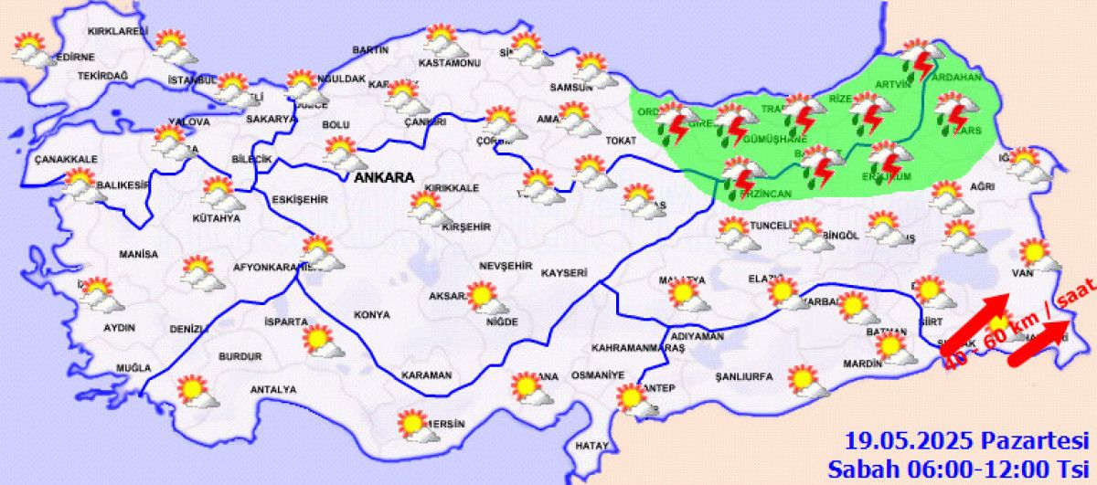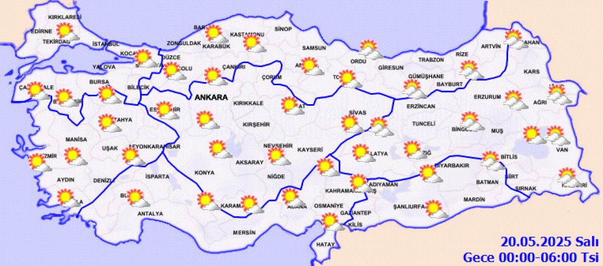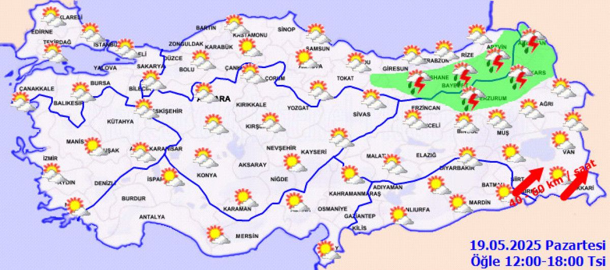 RÜZGAR: Rüzgarın çoklukla güneyli taraflardan orta kuvvette, Doğu Anadolu’nun güneydoğusunda kuvvetli (40-60 km/sa) olarak eseceği varsayım ediliyor.