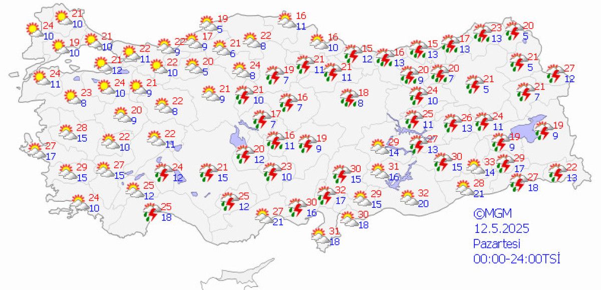 Diyarbakır: 31 C Kesimli ve çok bulutlu, öğlen saatlerinden sonra sağanak ve gök gürültülü sağanak yağışlı,