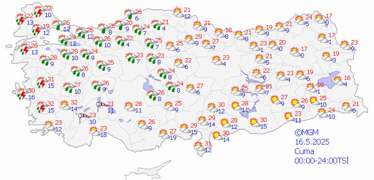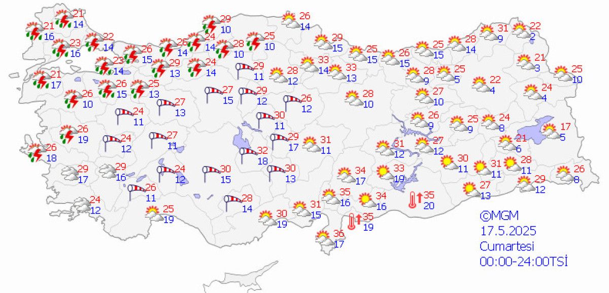 Marmara, Ege Bölgesi (Muğla ve Denizli dışında), Batı Karadeniz (Sinop hariç), İç Anadolu’nun kuzeybatı kesitleri ile Antalya, Isparta ve Kırıkkale etraflarında aralıklı sağanak ve gök gürültülü sağanak yağış görülecek.