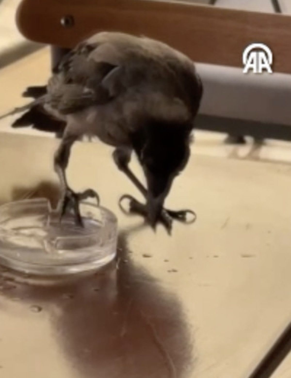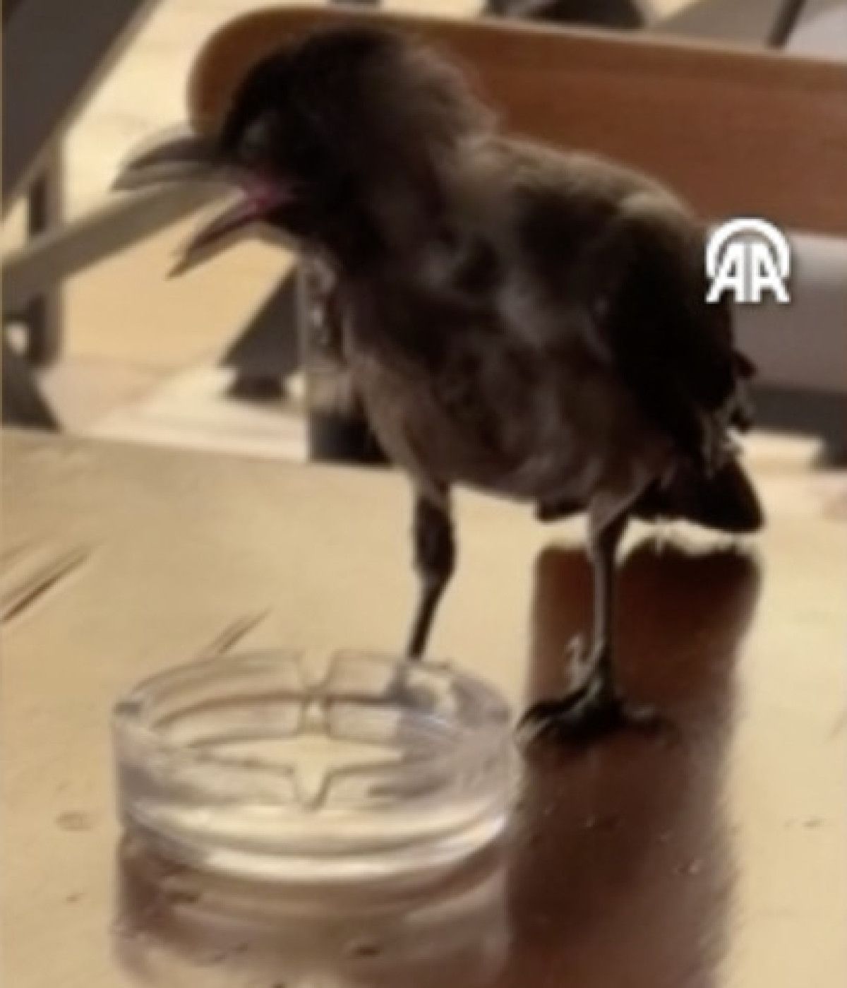 Görüntülerde, karganın ağzı açık formda sandalyeye konduğu ve işletme sahibince verilen suyu içmesi yer alıyor.
