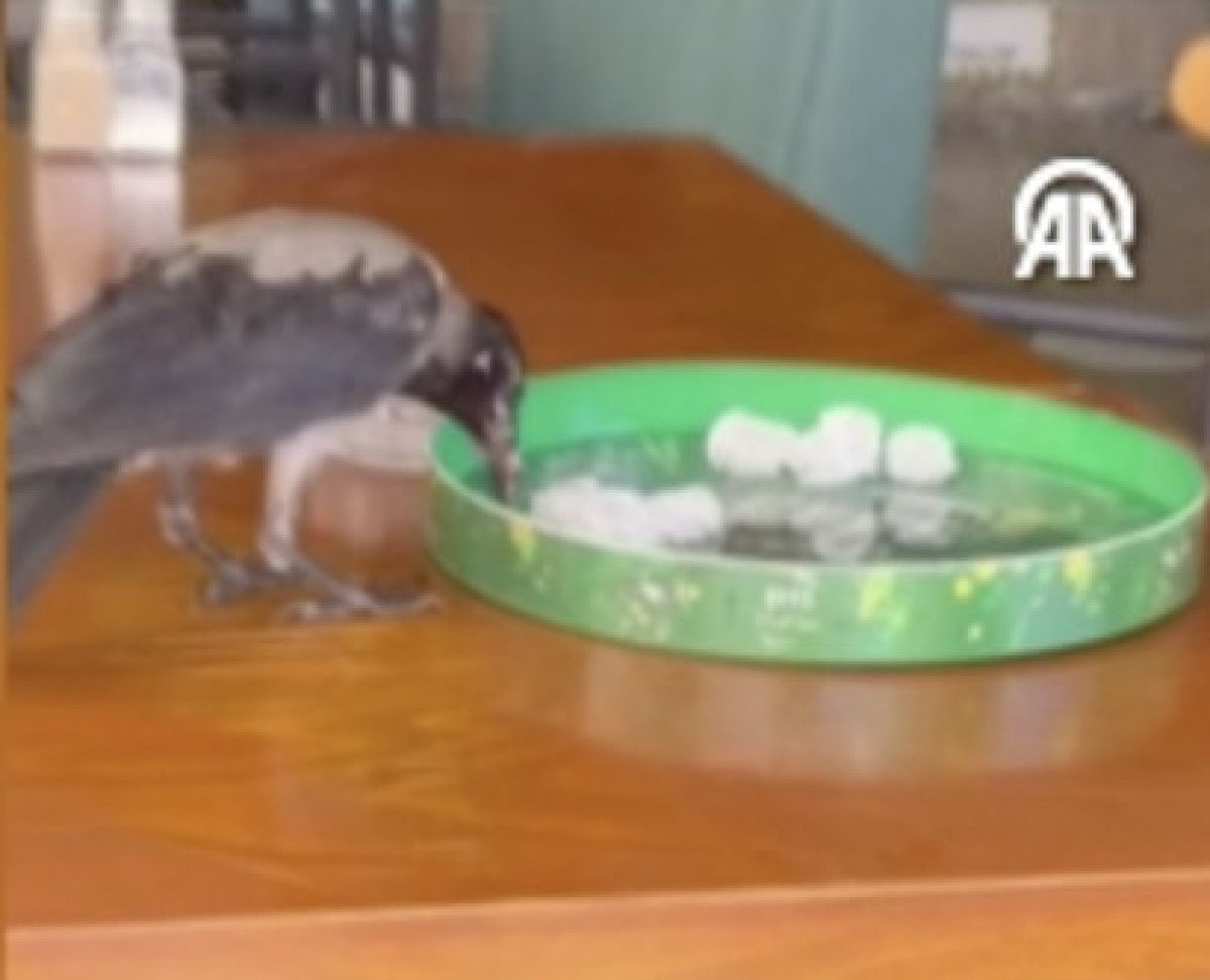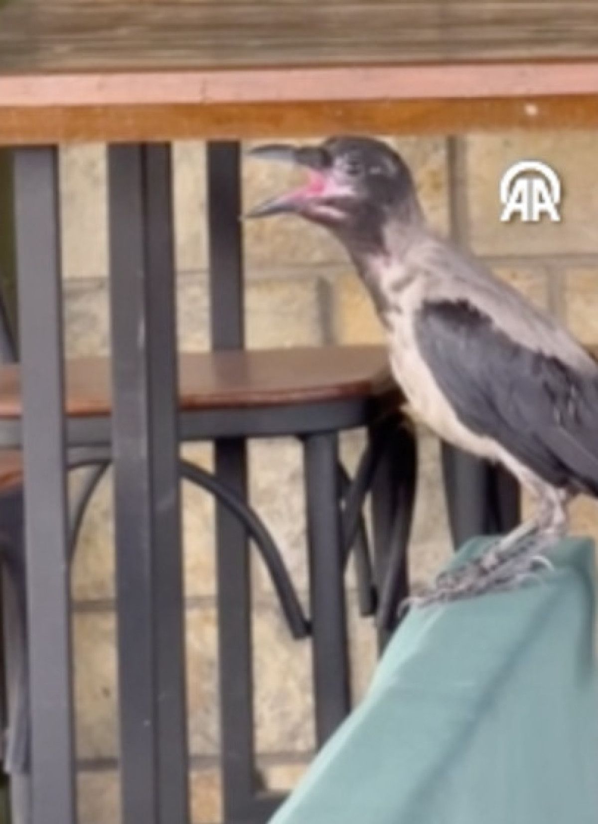 Bir tepsideki buzlu sudan da içen karganın kafedekilerin verdiği yiyeceklerden de yediği, daha sonra uçarak bölgeden uzaklaştığı görülüyor.