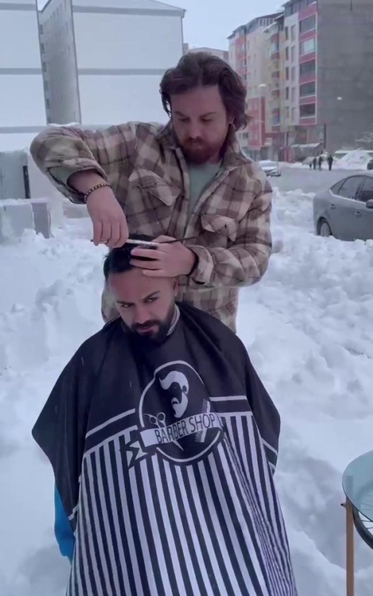 kar yağışı ve soğuğa aldırmayan Kaya, müşterilerini açık havada tıraş etmeye başladı.