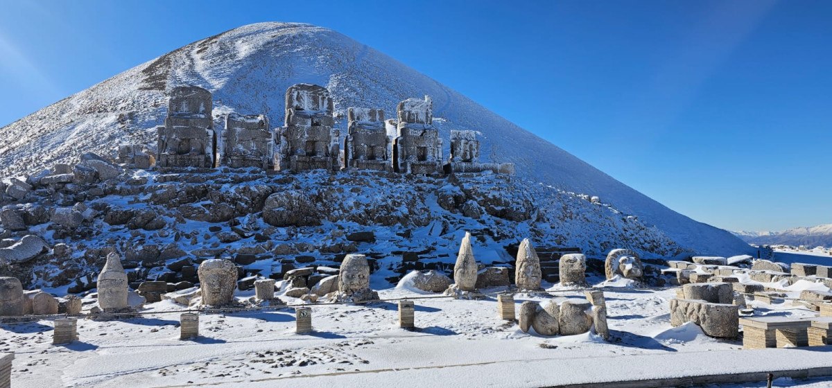 Güneşin doğuşunun ve batışının en güzel izlendiği yer olarak bilinen Adıyaman’daki 2 bin 206 metre rakımlı Kommagene Krallığı’na ait 50 metre yüksekliğinde, 150 metre çapındaki tümülüs ve dev heykellerin bulunduğu, yerli ve yabancı turistlerin akınına uğrayan Nemrut Dağı’nda kar yağışı ile birlikte yabancı turistler gelmeye başladı.