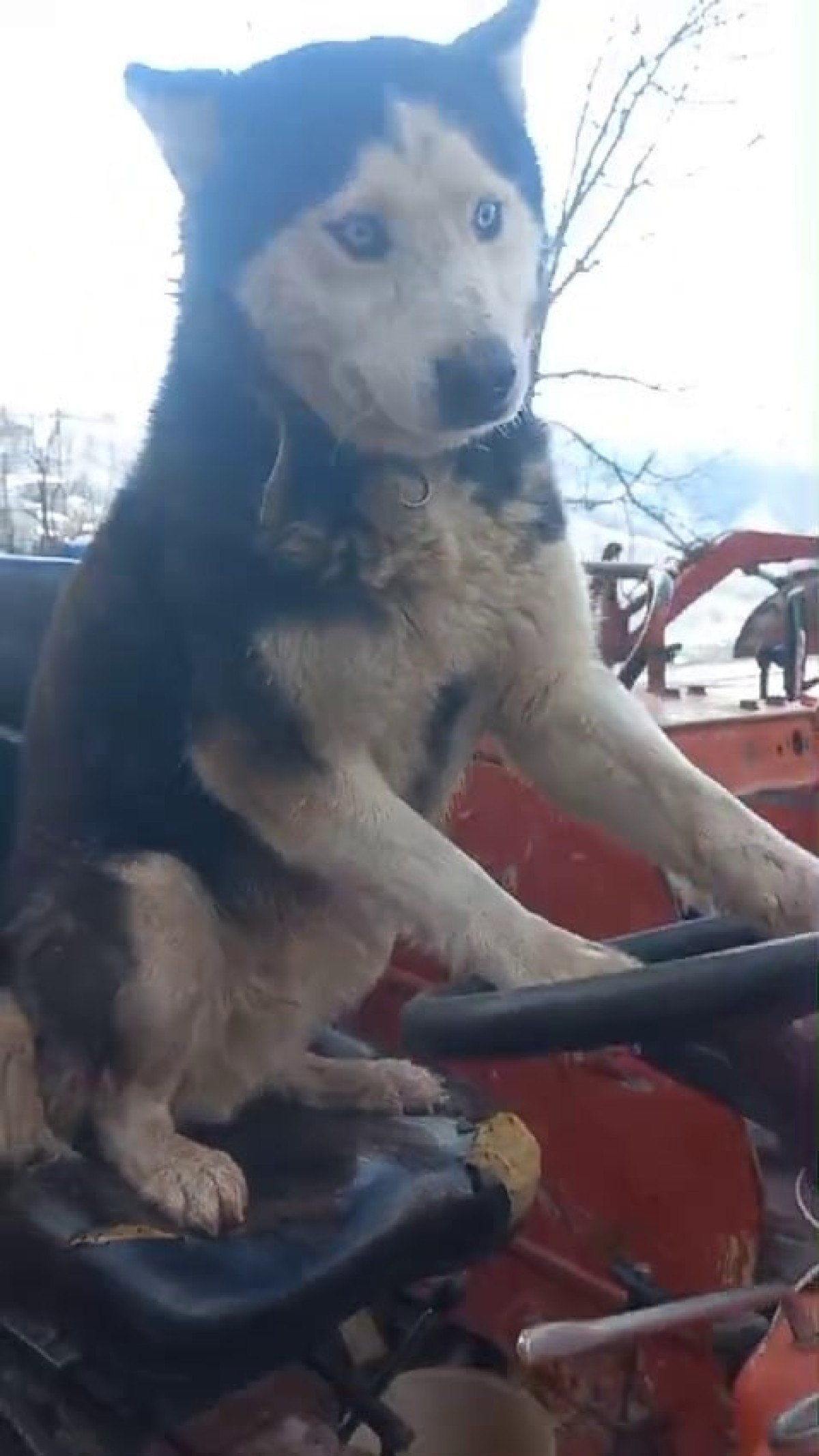 Karda metrelerce traktör kullandıran sahibi, o anları cep telefonuyla kaydederek, kar üzerindeki traktörün direksiyonunda köpeğin olduğu görüntüleri paylaştı.