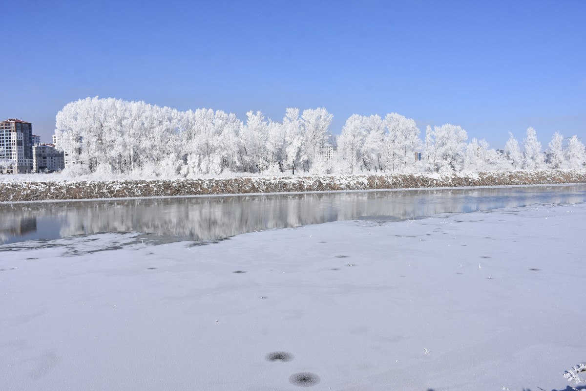 Türkiye’nin en uzun nehri Kızılırmak’ın Sivas kent merkezinden geçen bölümlerinin kısmen buzla kaplandığı görüldü. Soğuk havanın etkisi ile su akışının zayıf olduğu bölümlerin yüzeyi buz tuttu. Nehir kenarında bulunan ve kırağı ile kaplanan ağaçlarsa güzel manzaralar oluşturdu.