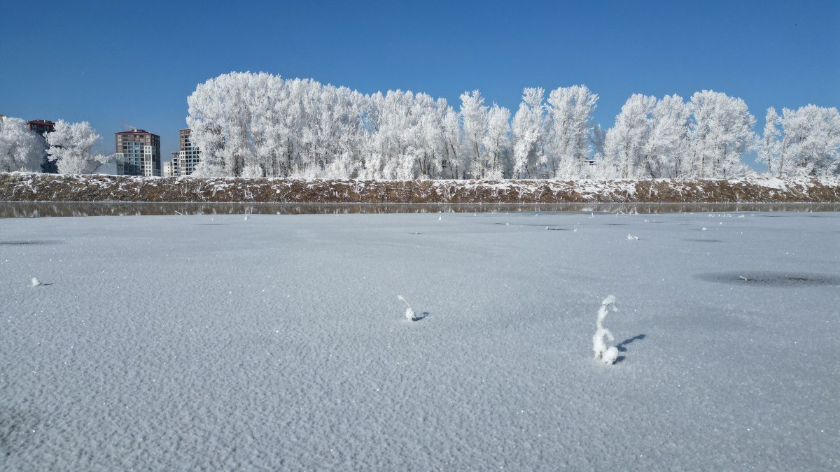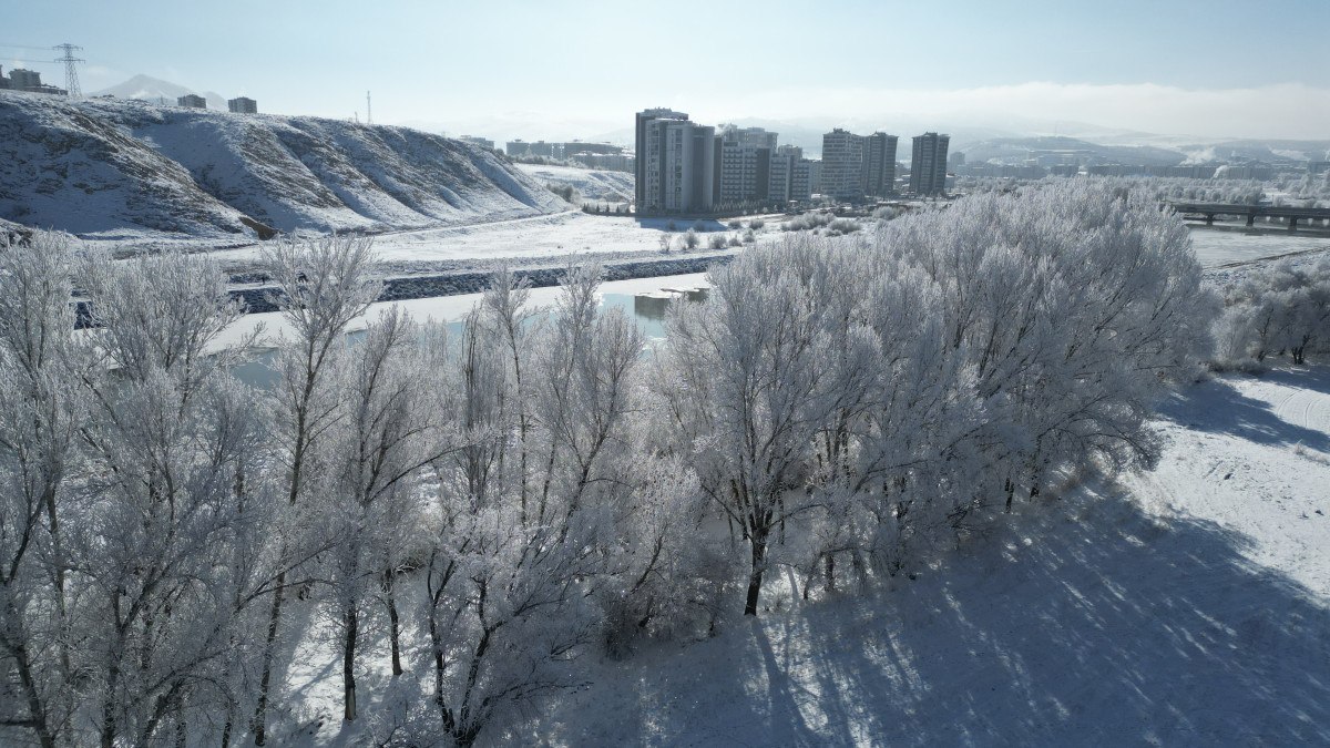 Soğuk hava nedeniyle kırağı meydana gelirken, ağaçlar beyaz örtülerle kaplandı.