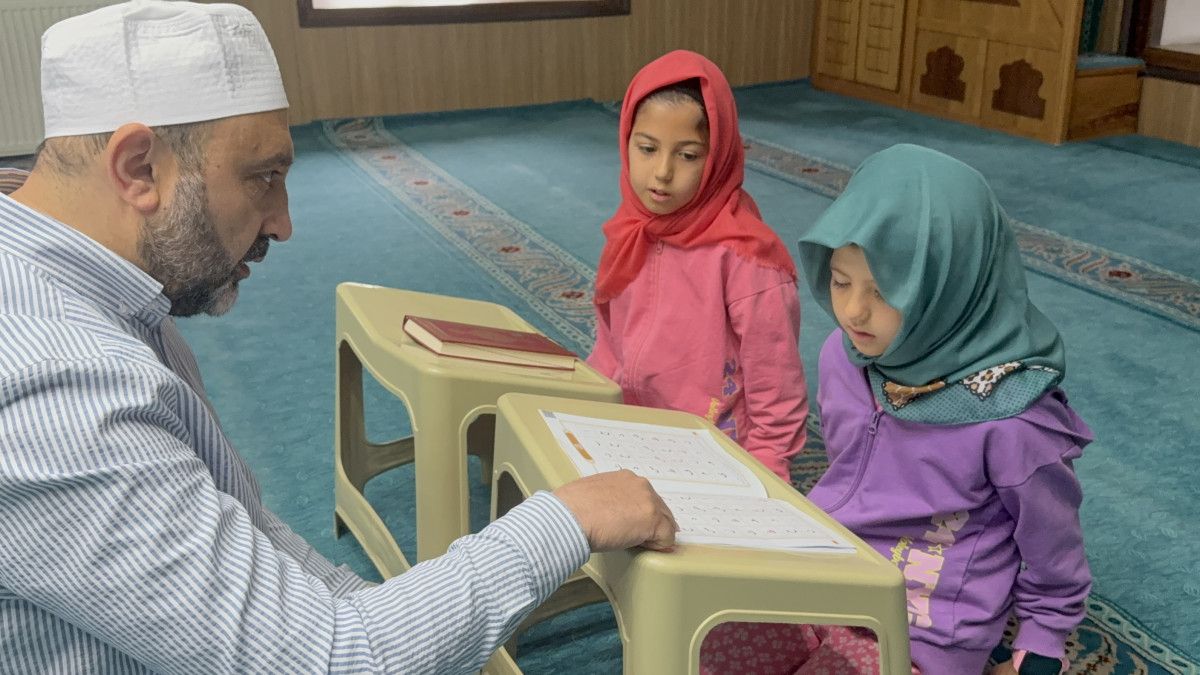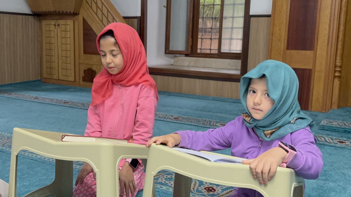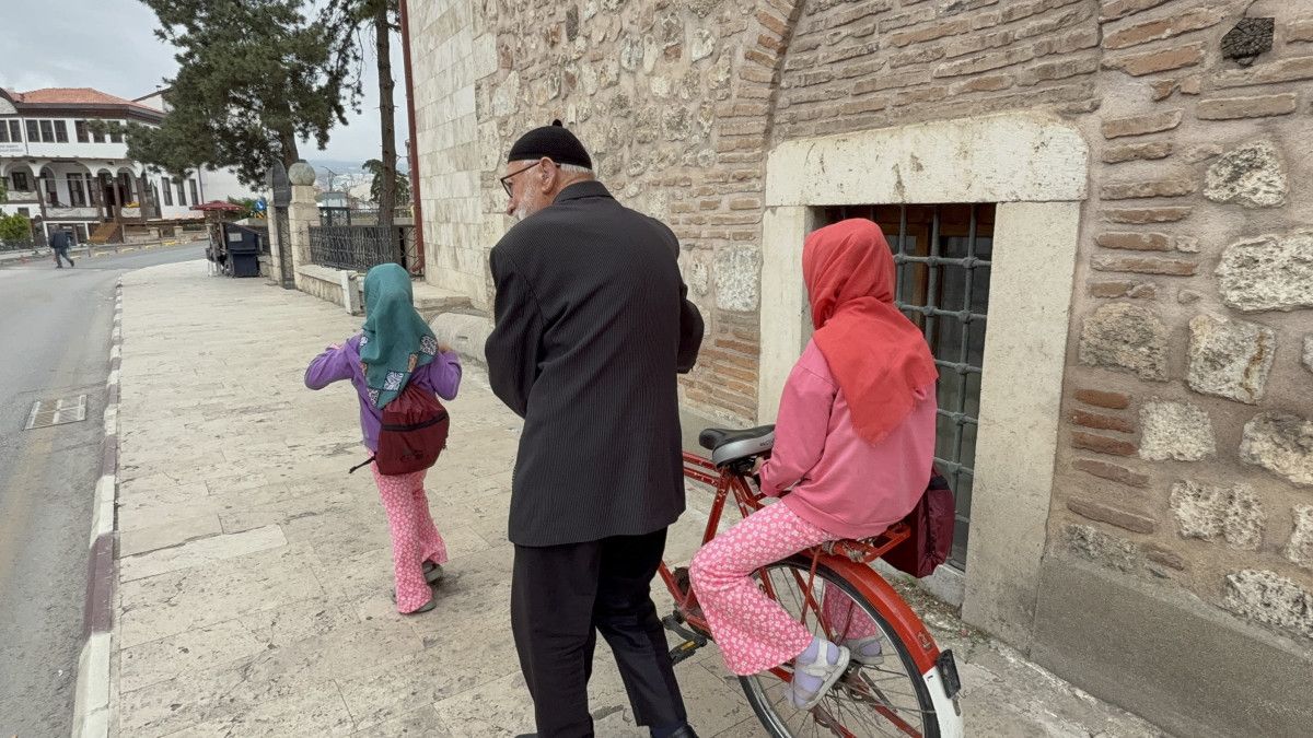 Küçük torununu bisikletin gerisine oturtan Kaya, öteki torunuyla yürüyerek caminin yolunu tutuyor.