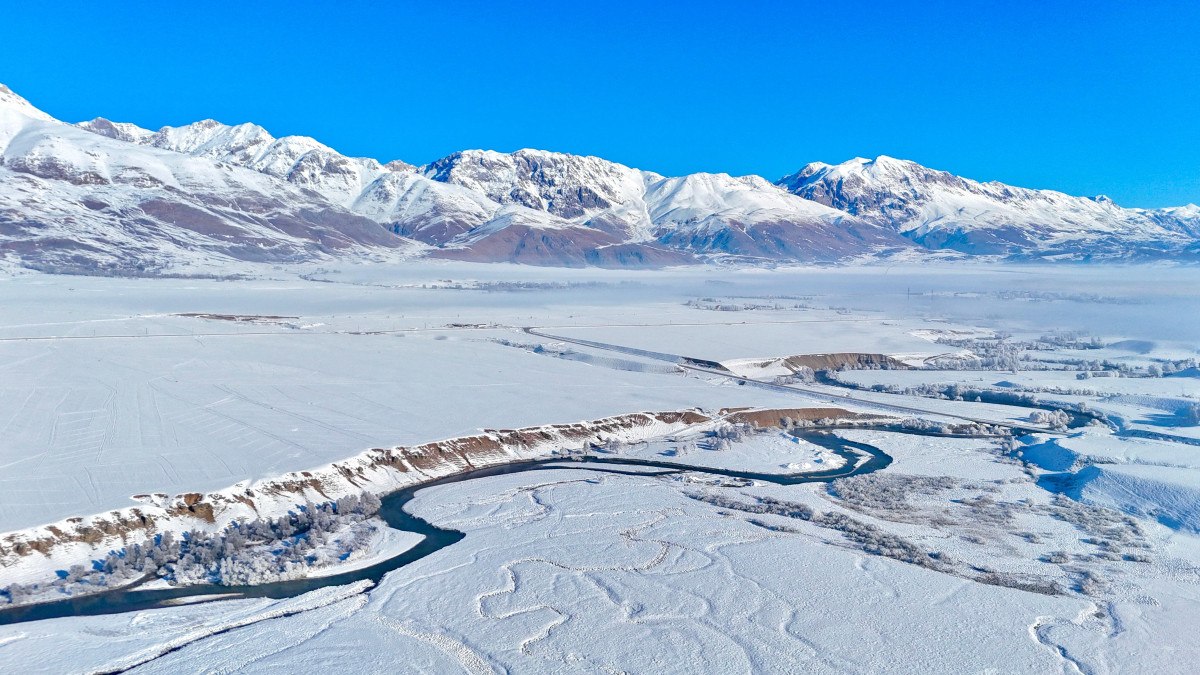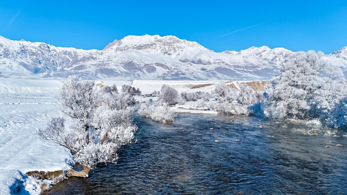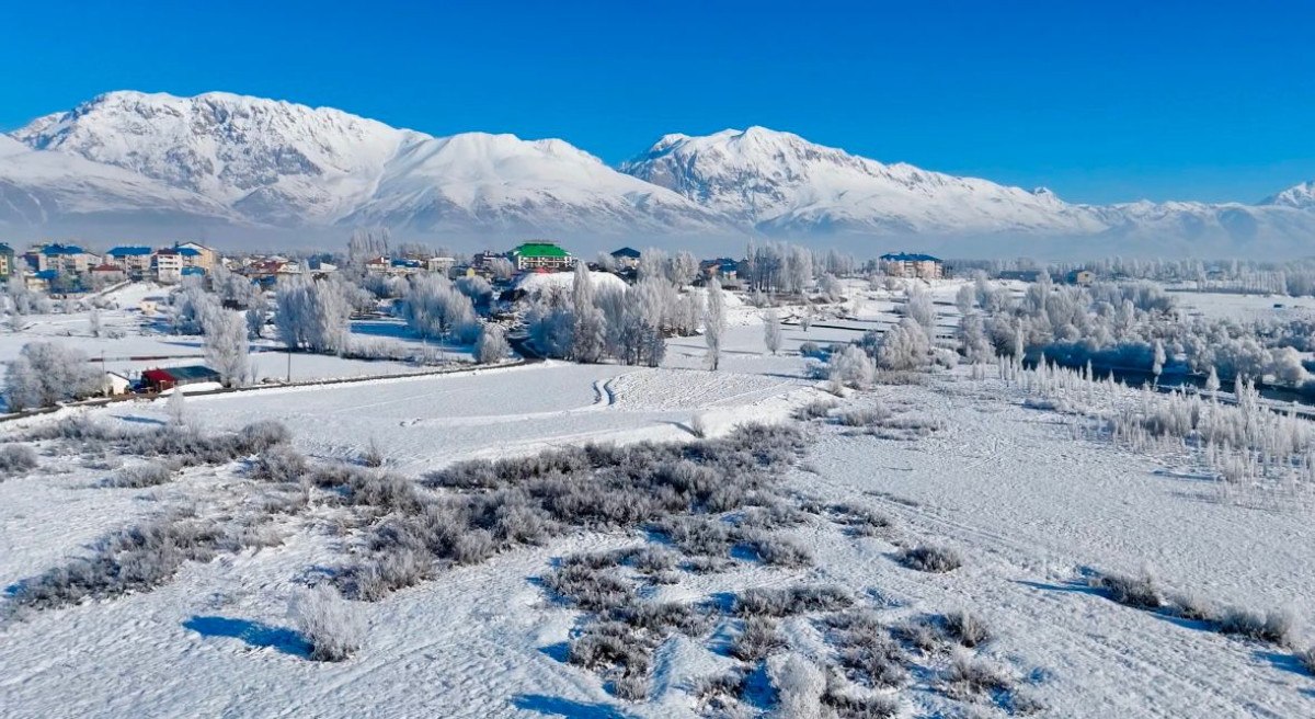 Karla kaplı dağların, kırağıyla beyaza bürünmüş ağaçların, gökyüzüyle ve ilçeden doğan Munzur Nehri ile oluşturduğu manzara havadan görüntülendi. Bölgedeki güzel görüntüler de ilgi çekti.
