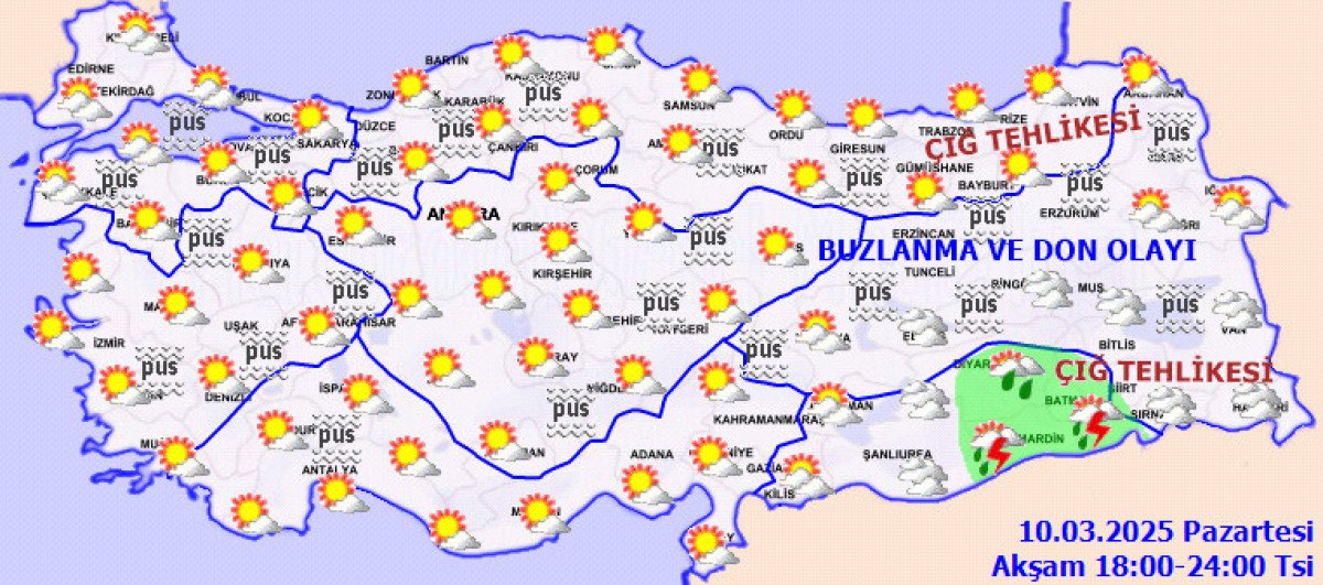 Parçalı yer yer çok bulutlu, Şırnak çevreleri ile Malatya ve Elazığ’ın güney ilçelerinin sağanak ve gök gürültülü sağanak yağışlı geçeceği tahmin ediliyor. Sabah ve gece saatlerinde bölge genelinde buzlanma ve don olayı ile birlikte pus ve yer yer sis bekleniyor. Bölgenin yüksek ve eğimli yamaçlarında çığ tehlikesi bulunmaktadır.