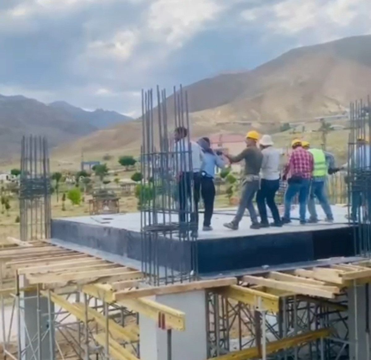 Başkale ilçesinde bir hastanenin inşaatında çalışan personellerin halay çekip eğlendikleri anlar, cep telefonu kamerasına yansıdı.