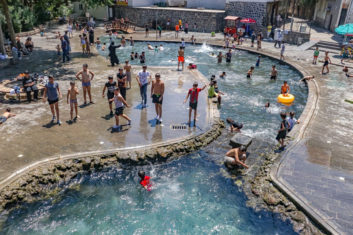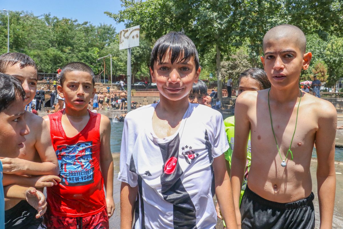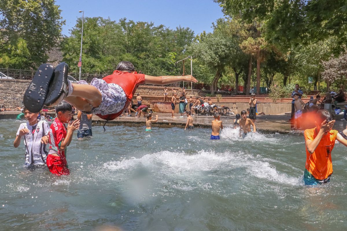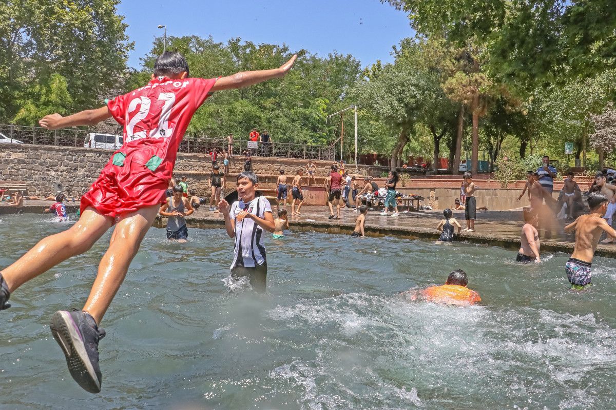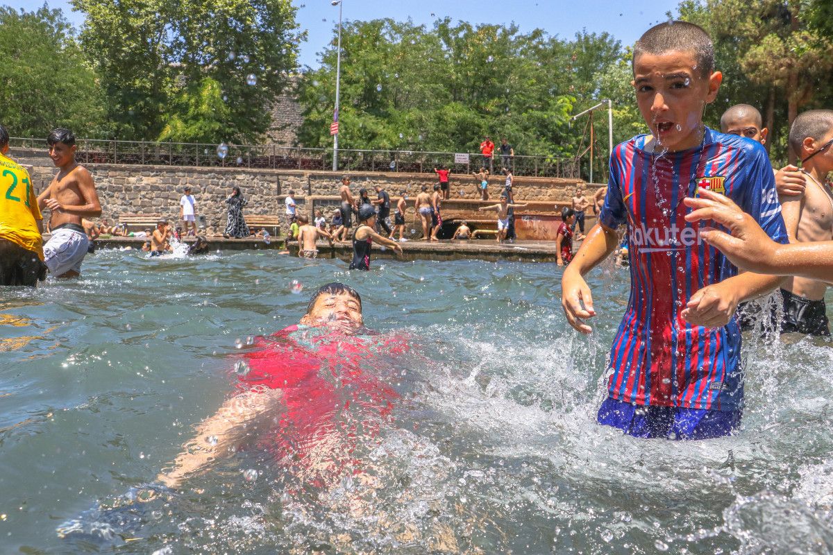 Kentte park ve bahçeler boş kalırken, sıcaktan bunalan çocuklar, Sur ilçesindeki tarihi Anzele Parkı’nda bulunan süs havuzuna akın etti.