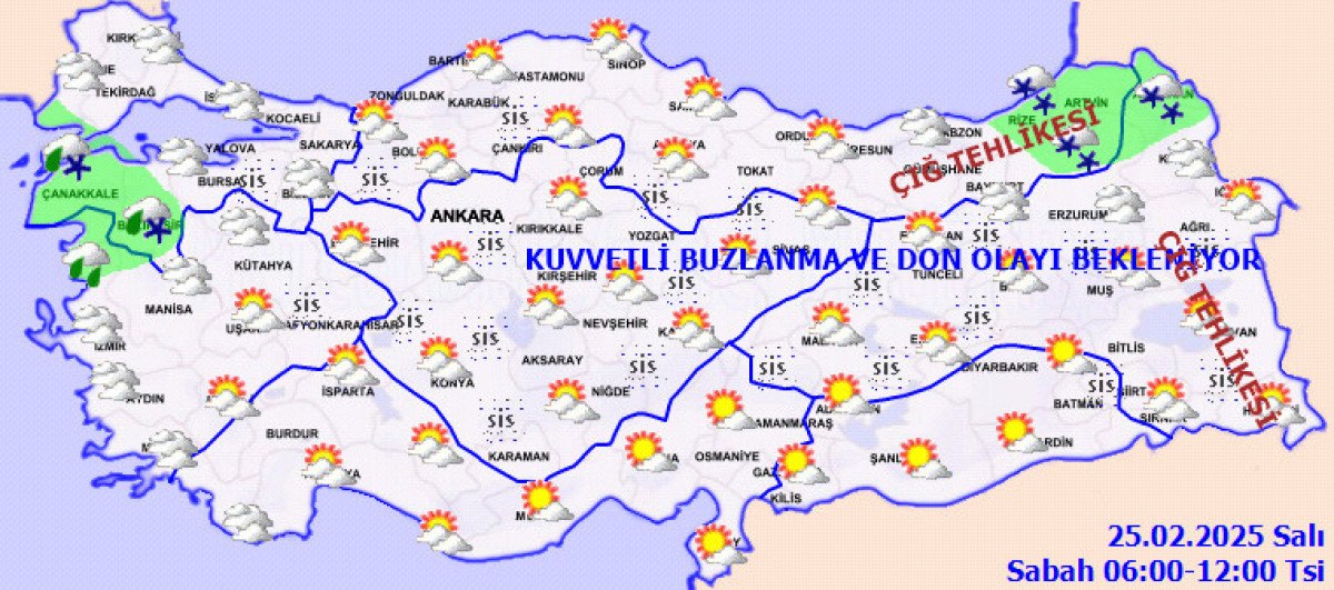 Yurdun kuzey, iç ve doğu kesimlerinde buzlanma ve don ile birlikte pus ve yer yer sis hadisesi bekleniyor. Doğu Karadeniz’in iç kesimlerinin yüksekleri ile Doğu Anadolu’nun yüksek ve dik yamaçlarında çığ tehlikesi bulunmaktadır.” notu düşüldü.