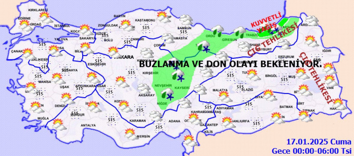 Sabah ve gece saatlerinde iç ve doğu kesimlerinde buzlanma ve don ile birlikte pus ve yer yer sis bekleniyor. Doğu Karadeniz’in iç kesimlerinin yüksekleri ile Doğu Anadolu’nun yüksek ve dik yamaçlarında çığ tehlikesi bulunmaktadır.” notu düşüldü.