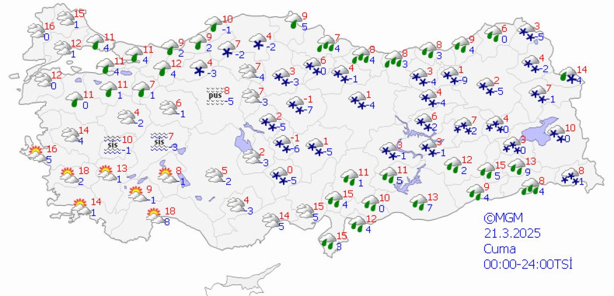Çok bulutlu, öğle saatlerinden itibaren yağmur ve karışık yağmurlu, yüksekleri kar yağışlı
