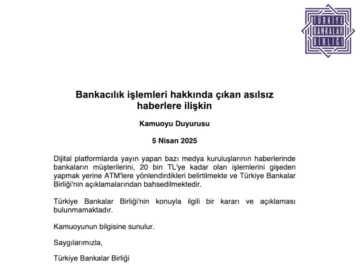 “Bankacılık işlemleri hakkında çıkan asılsız haberlere ilişkin; dijital platformlarda yayın yapan bazı medya kuruluşlarının haberlerinde bankaların müşterilerini, 20 bin TL’ye kadar olan işlemlerini gişeden yapmak yerine ATM’lere yönlendirdikleri belirtilmektedir. Türkiye Bankalar Birliği’nin konuyla ilgili bir kararı ve açıklaması bulunmamaktadır.”