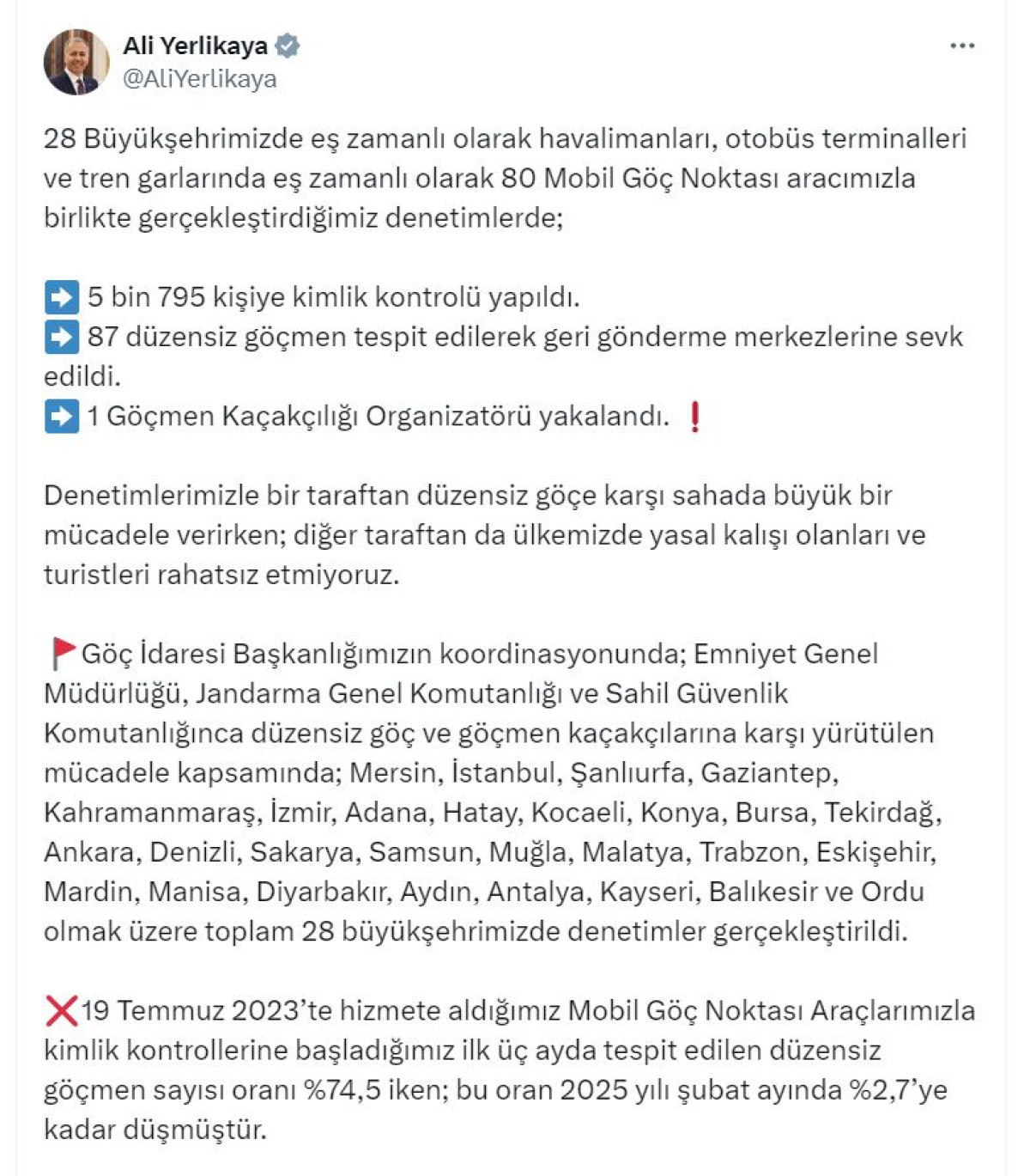 İçişleri Bakanı Ali Yerlikaya, sosyal medya hesabından yaptığı açıklamada, düzensiz göç ve göçmen kaçakçılığıyla mücadele kapsamında ülke genelinde geniş çaplı denetimlerin gerçekleştirildiğini duyurdu. Göç İdaresi Başkanlığı’nın koordinasyonunda; Emniyet Genel Müdürlüğü, Jandarma Genel Komutanlığı ve Sahil Güvenlik Komutanlığı tarafından 28 büyükşehirde eş zamanlı denetimler yapıldı.