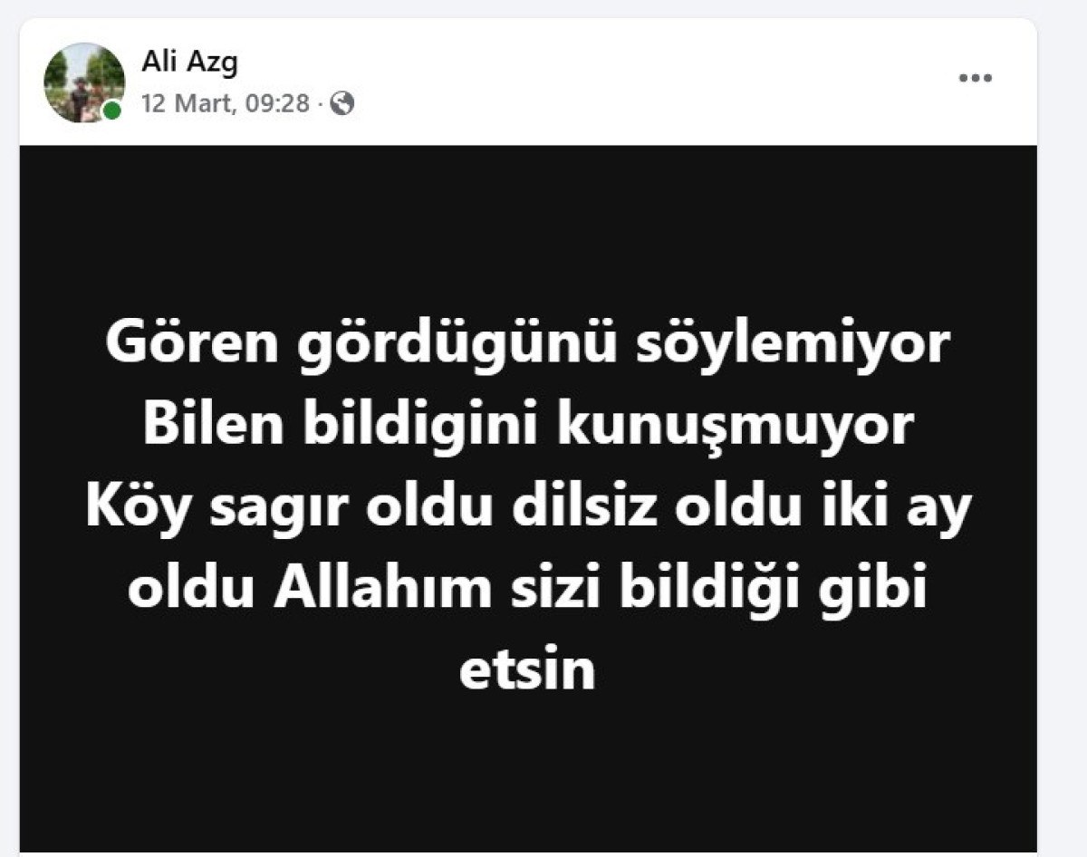 Sosyal medya hesabından paylaşımda bulunan baba Ali Azgın,” Gören gördüğünü söylemiyor, bilen bildiğini konuşmuyor köy sağır, dilsiz oldu. İki ay oldu. Allah’ım sizi bildiği gibi etsin” diyerek tepkisini dile getirdi.