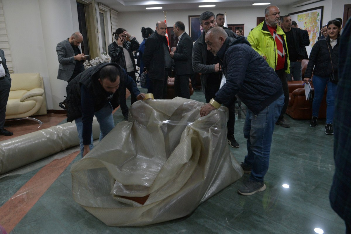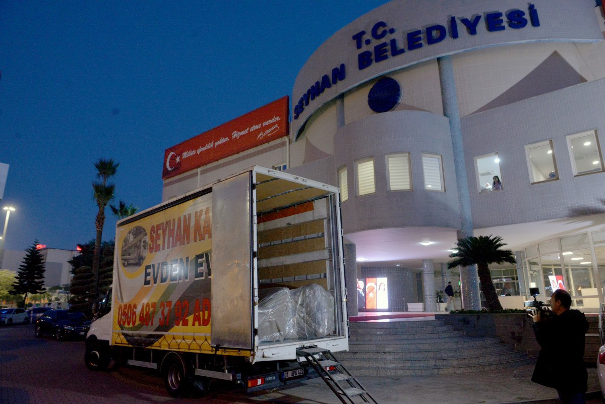 Belediyeye gelen icra memurları, Başkan Tekin’in makam odasındaki koltuk, masa ve sandalye gibi eşyaları haczederek kamyonete yükledi.