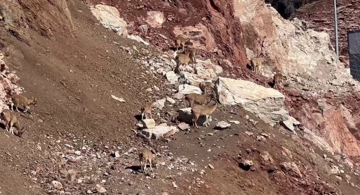 Kara yoluna yakın bir yerde güneşlenen dağ keçilerini fark eden bazı araç sürücüleri de cep telefonlarıyla dağ keçilerini görüntüledi.