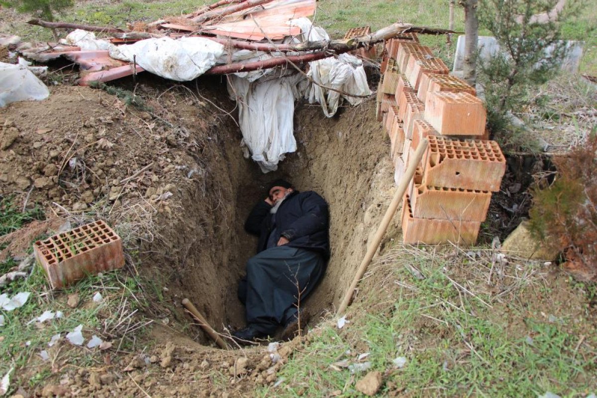 Yağışlardan etkilenmemesi için üstünü naylon ve çatı parçalarıyla kapattığı mezara gelip dua da eden 5 çocuk babası Karabela, “Kimseye zahmet vermemek için mezarımı kendim kazdım. Allah nasip ederse beni buraya defnetsinler” dedi.