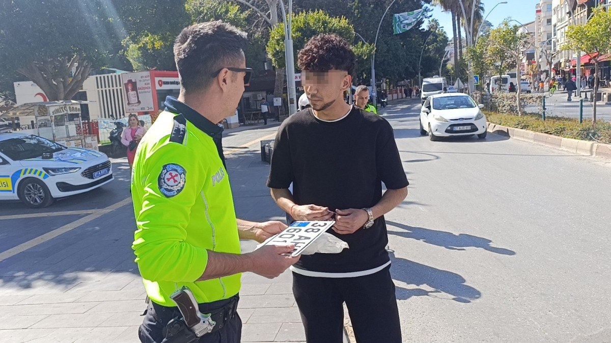 Denetim sırasında trafik ekiplerinin durdurduğu bir motorlu bisikletin plakasının oturağının altında olduğu, sürücüsünün ise ehliyetinin bulunmadığı belirlendi.