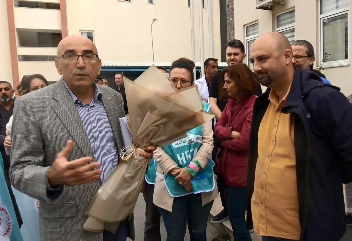 Açıklamanın ardından Doktor Orhan Tekin, saldırıya uğrayan doktor Ali Volkan Kaya’ya çiçek verdi.
