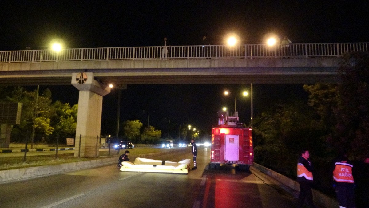 Gece saatlerinde Gazi Bulvarı üzerinde bulunan üst geçitten geçen vatandaşlar, korkulukların dış kısmında bir gencin bulunduğunu görünce durumu polise bildirdi.