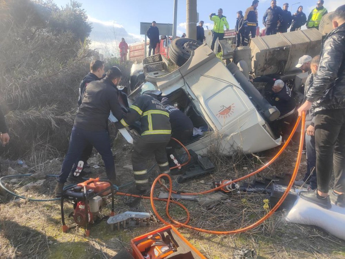 Aydın’ın Kuşadası ilçesi Yeniköy yolu üzerinde virajı alamayarak yol kenarındaki tarlaya uçan yem yüklü tırda bulunan sürücüyle birlikte 4 kişi araçta sıkıştı.