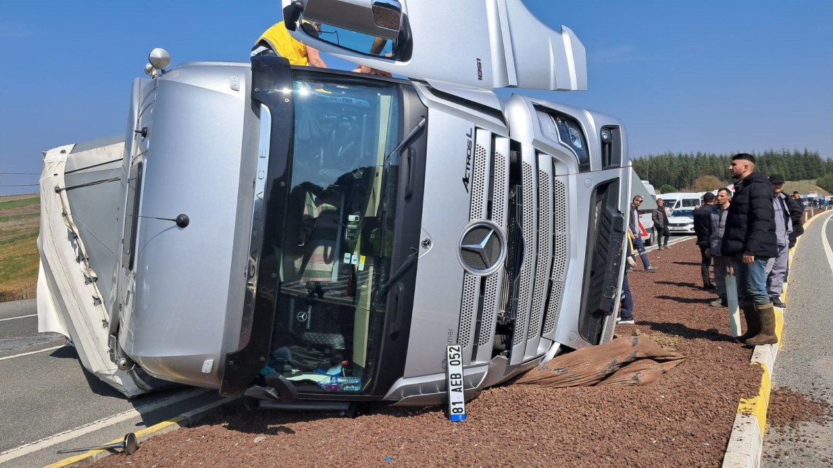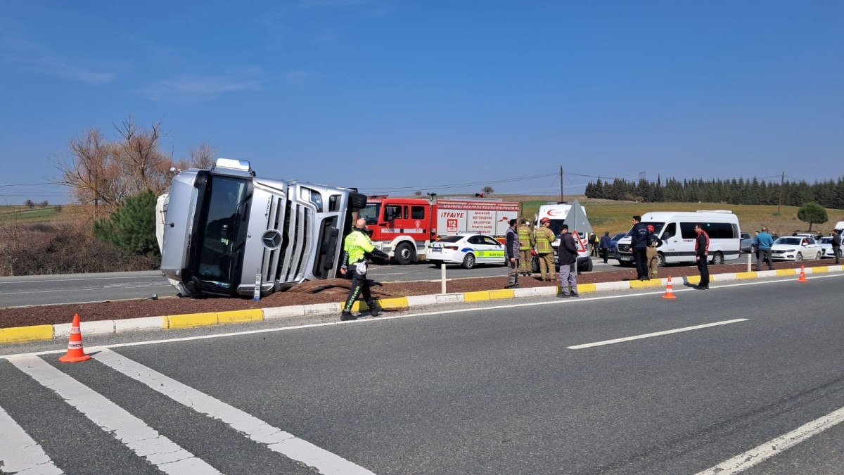 81 plakalı tır, Çağdaş Kent civarında tek taraflı trafik kazasında yan yattı.