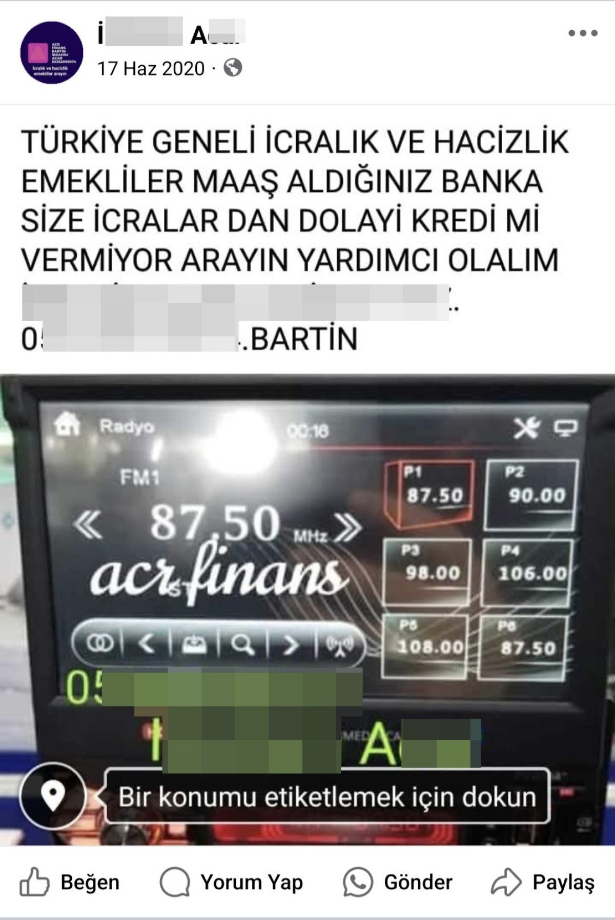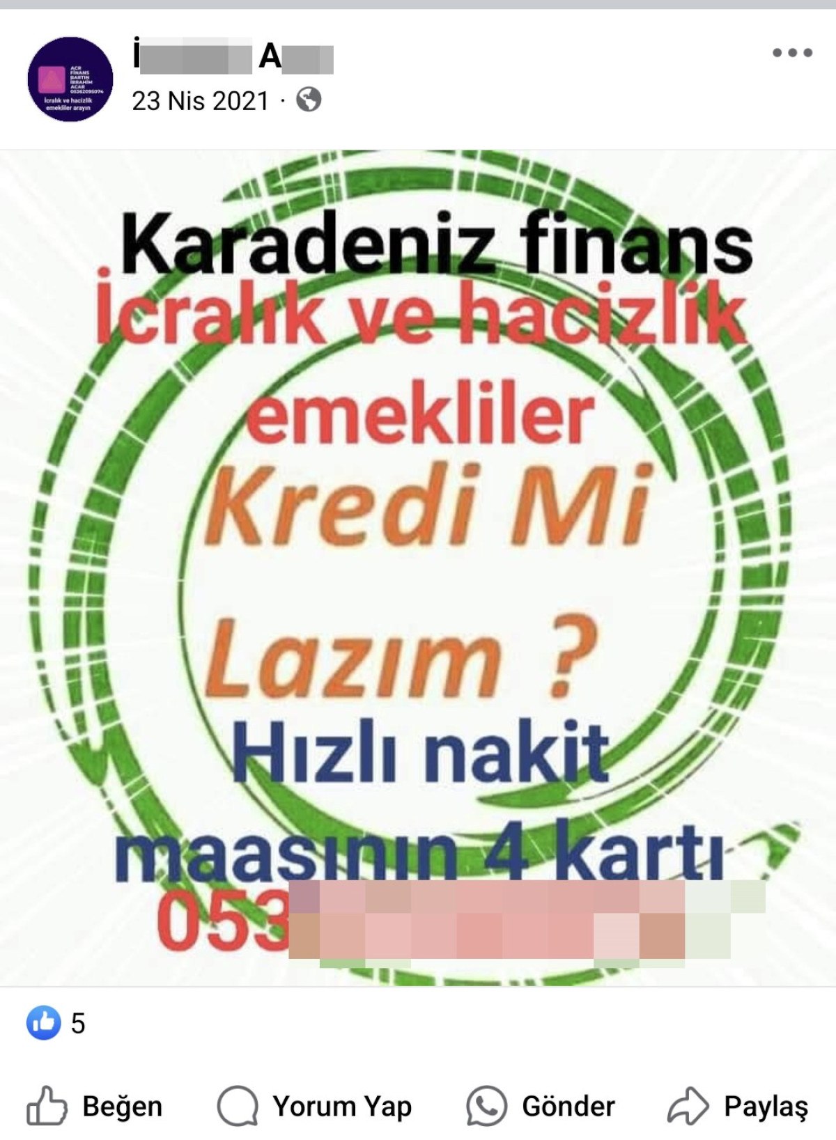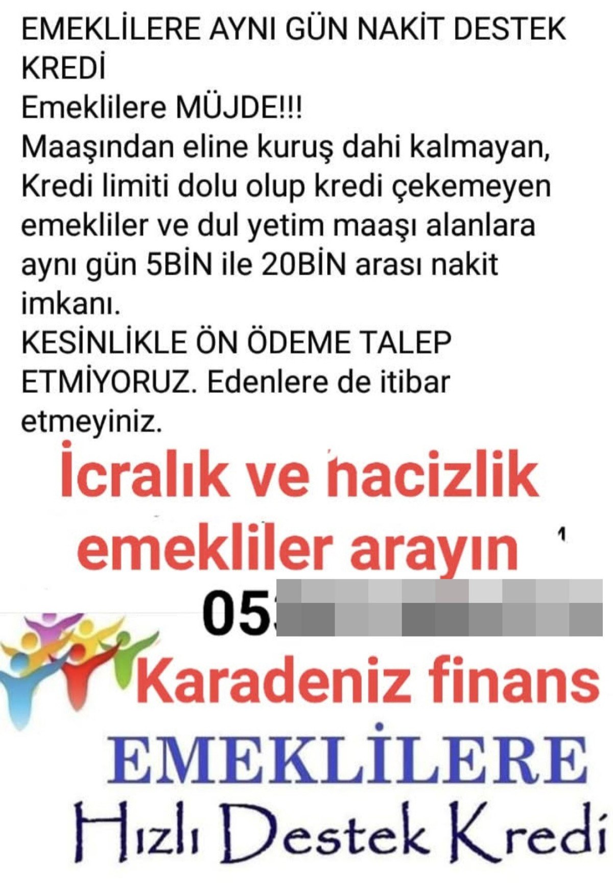 Dolandırıcılar konusunda uyarıda bulunarak güven telkin eden paylaşımlardan birinde ise, “İcralik emekliye maaştan muafakatla, altın, telefon ve kömür. Nakit ihtiyacınızı ayni gün çözüyoruz. Ön ödeme isteyen dolandırıcılara inanmayın” ifadeleri kullanıldı.