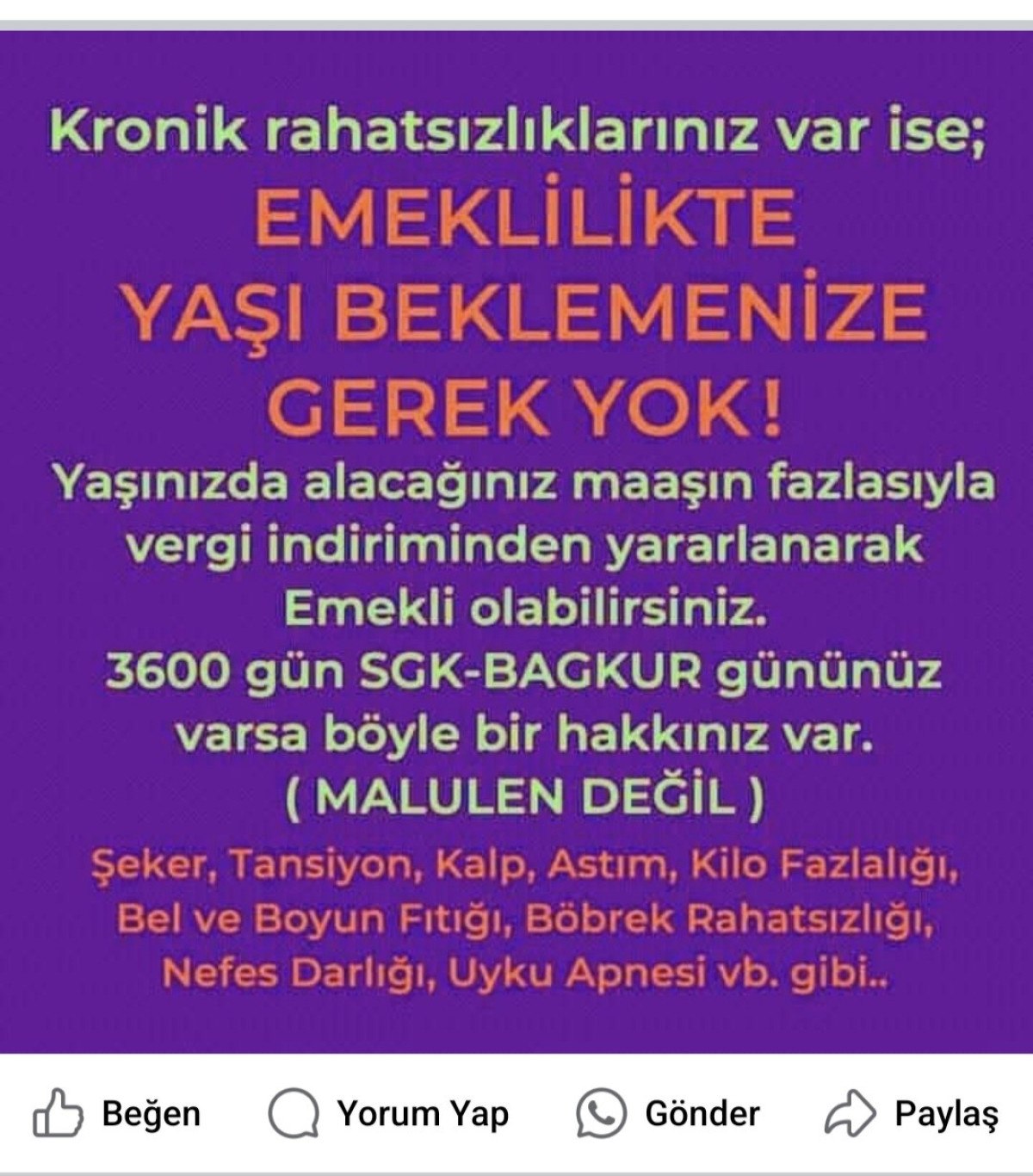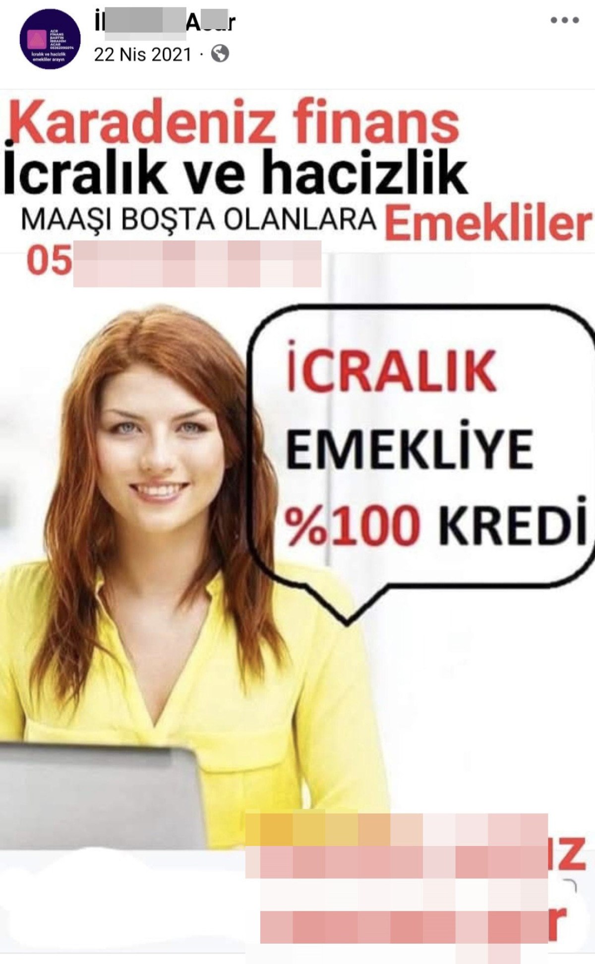 Sosyal medya aracılığıyla yapılan bir reklamda, “Maaşı boşta olanlara, icralık emekliye yüzde 100 kredi. İcralik ve hacizlik emekliler arayın. Kronik rahatsızlıklarınız var ise; emeklilikte yaşı beklemenize gerek yok. Yaşınızda alacağınız maaşın fazlasıyla vergi indiriminden yararlanarak emekli olabilirsiniz. 3600 gün SGK-Bağ-Kur gününüz varsa böyle bir hakkınız var. (Malulen değil). Şeker, tansiyon, kalp, astım, kilo fazlalığı, bel ve boyun fıtığı, böbrek rahatsızlığı, nefes darlığı, uyku apnesi gibi” ifadeler yer alırken, bir başka reklam paylaşımında ise, “Emeklilere aynı gün nakit destek kredi. Emeklilere müjde. Maaşından eline kuruş dahi kalmayan, kredi limiti dolu olup kredi çekemeyen emekliler ve dul yetim maaşı alanlara aynı gün 5 bin ile 20 bin arası nakit imkanı. Kesinlikle ön ödeme talep etmiyoruz. Edenlere de itibar etmeyiniz. İcralık ve hacizlik emekliler arayın” ifadeleri dikkat çekti.
