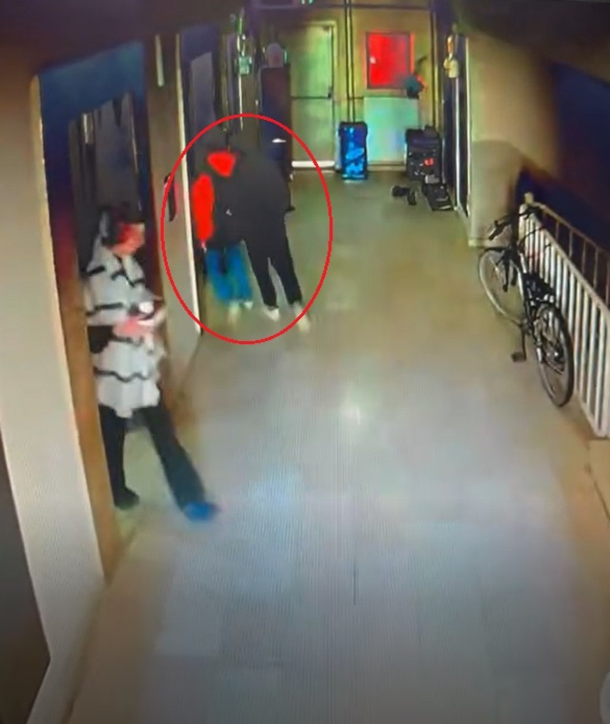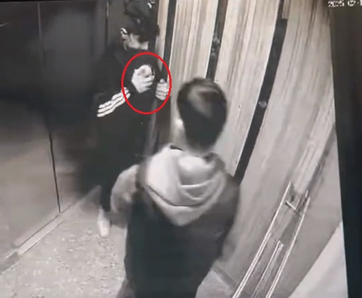 Şüpheliler, asansöre binip izlerini kaybettirirken, olayla ilgili polis incelemesi devam ediyor.