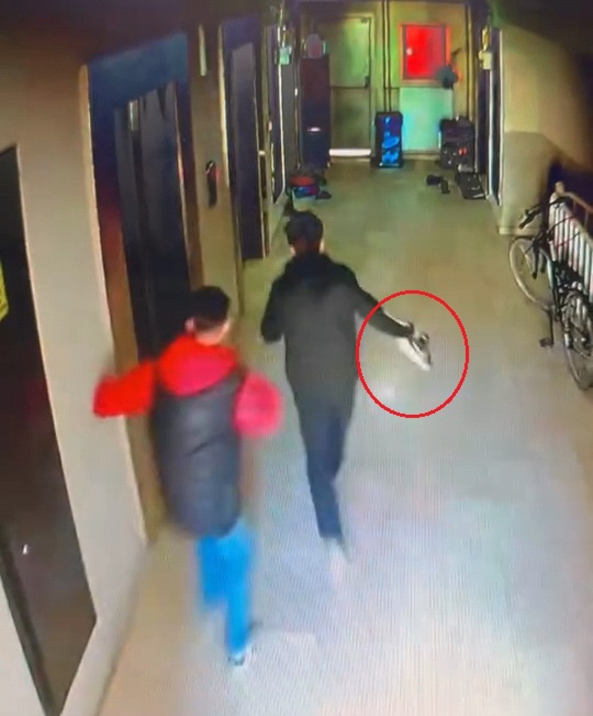 Güvenlik kamerasına yansıyan görüntülerde, şüphelilerden biri ayakkabıyı alırken, o sırada asansörden inen apartman sakini ile karşılaşıyor.