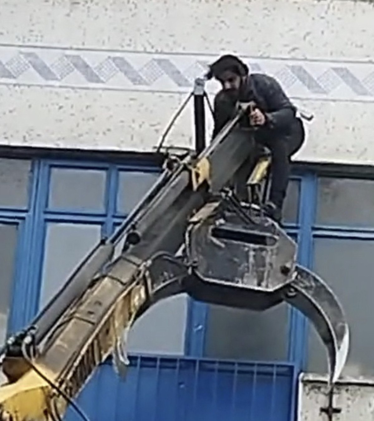 Görüntülerde, ismi öğrenilemeyen kişi pencereden sarkıp, vincin üstüne çıktı.