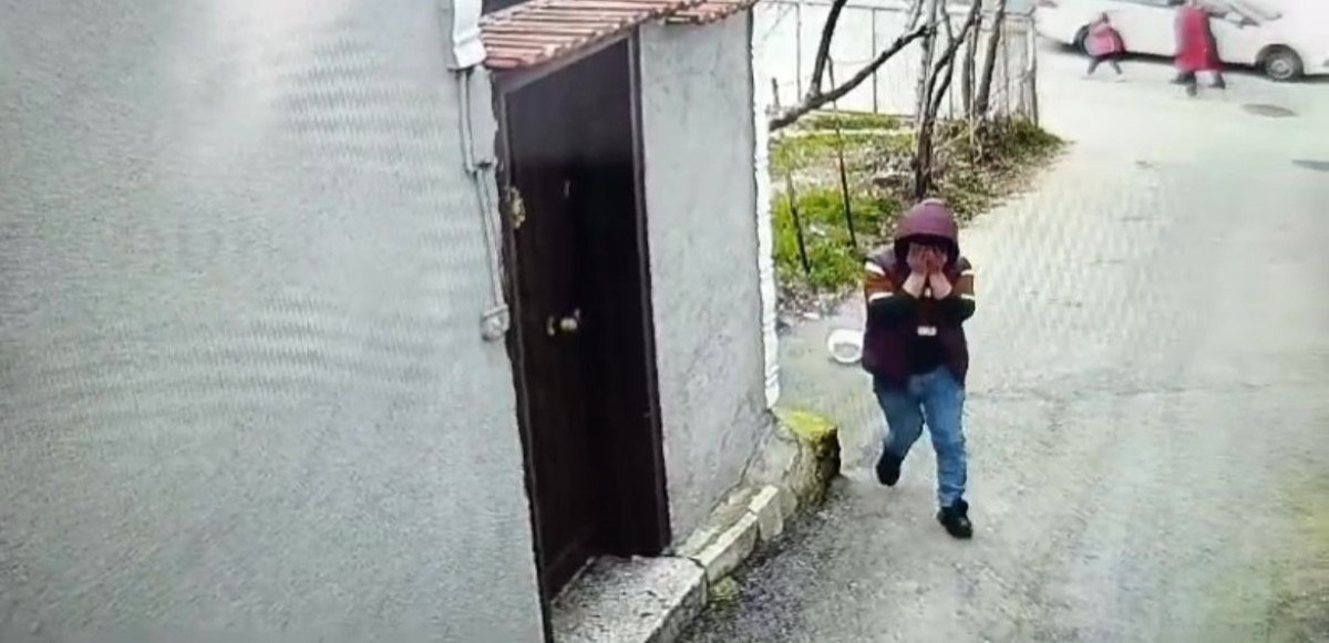 Ara sokaklardan ilerleyen şüpheli, bir binaya ait güvenlik kamerasını fark edince elleriyle yüzünü kapatıp adeta saklambaç oynadı.