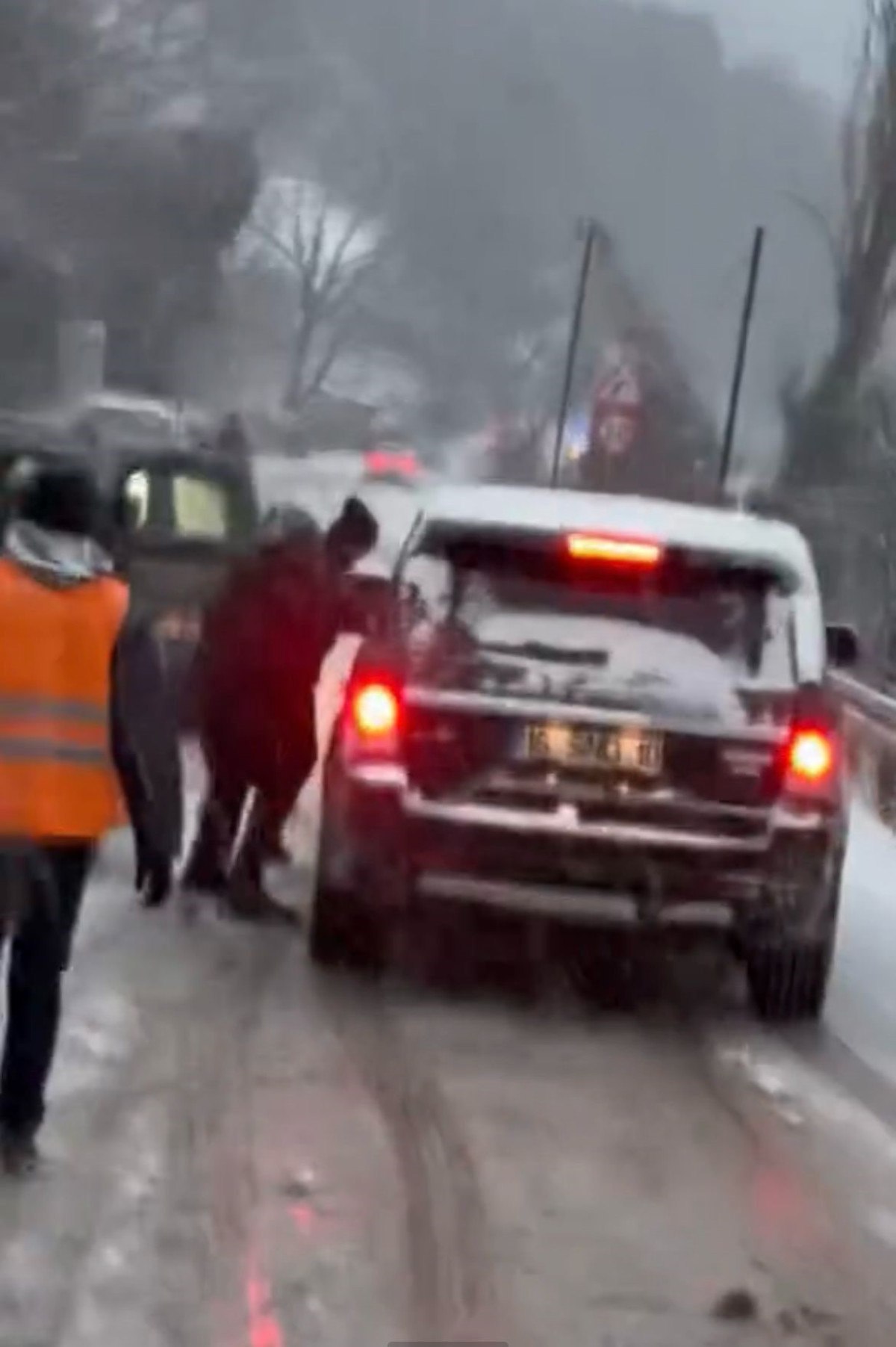 Fakat bu kez de yola tutunamayan araç karlı zeminde metrelerce kayınca, vatandaşlar aracı durdurmak için koşarak tutmaya çalıştı.