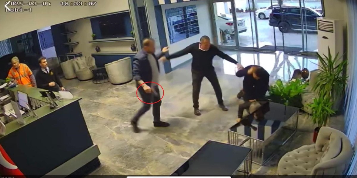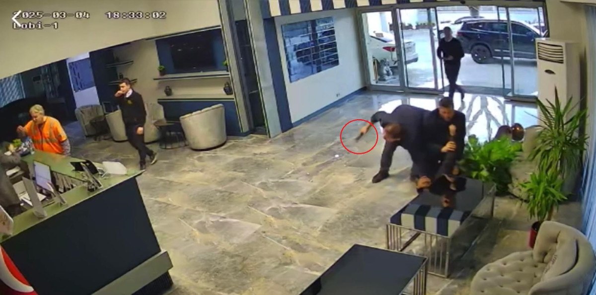Cevzet Ö.’ün, biri elinde tabanca bulunan 2 kardeşi tarafından lobide darbedildiği anlar, otelin güvenlik kamerasına da yansıdı.