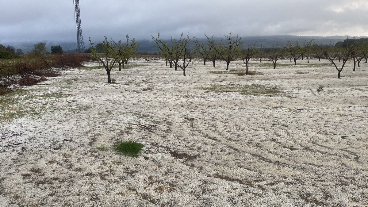Yaklaşık 1 saat aralıklarla süren dolu yağışı meyve bahçelerini beyaza bürüdü.
