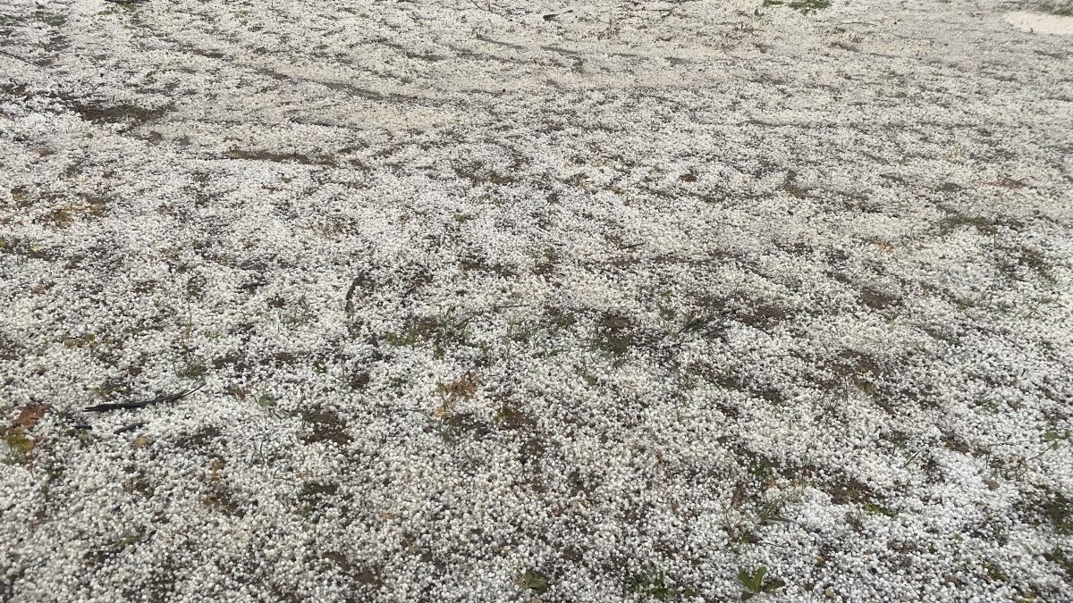 Yaklaşık 1 saat aralıklarla süren dolu yağışı meyve bahçelerini beyaza bürüdü.