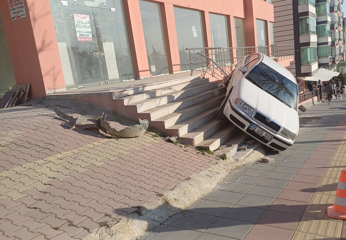 Çorum’un Mehmet Akif Ersoy Caddesi’nde engelli bireyin el frenini indirdiği otomobil, rampadan kayarak çıktığı merdivende asılı kaldı.