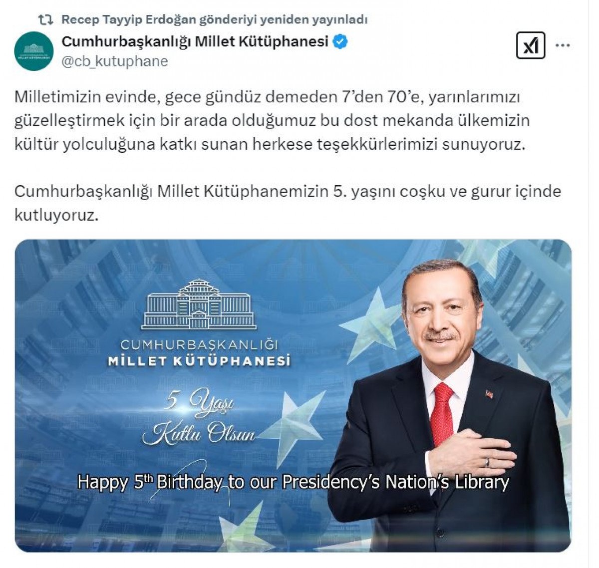 Cumhurbaşkanı Recep Tayyip Erdoğan da Cumhurbaşkanlığı Millet Kütüphanesi’nin bu paylaşımını alıntılayarak, kendi hesabında paylaştı.