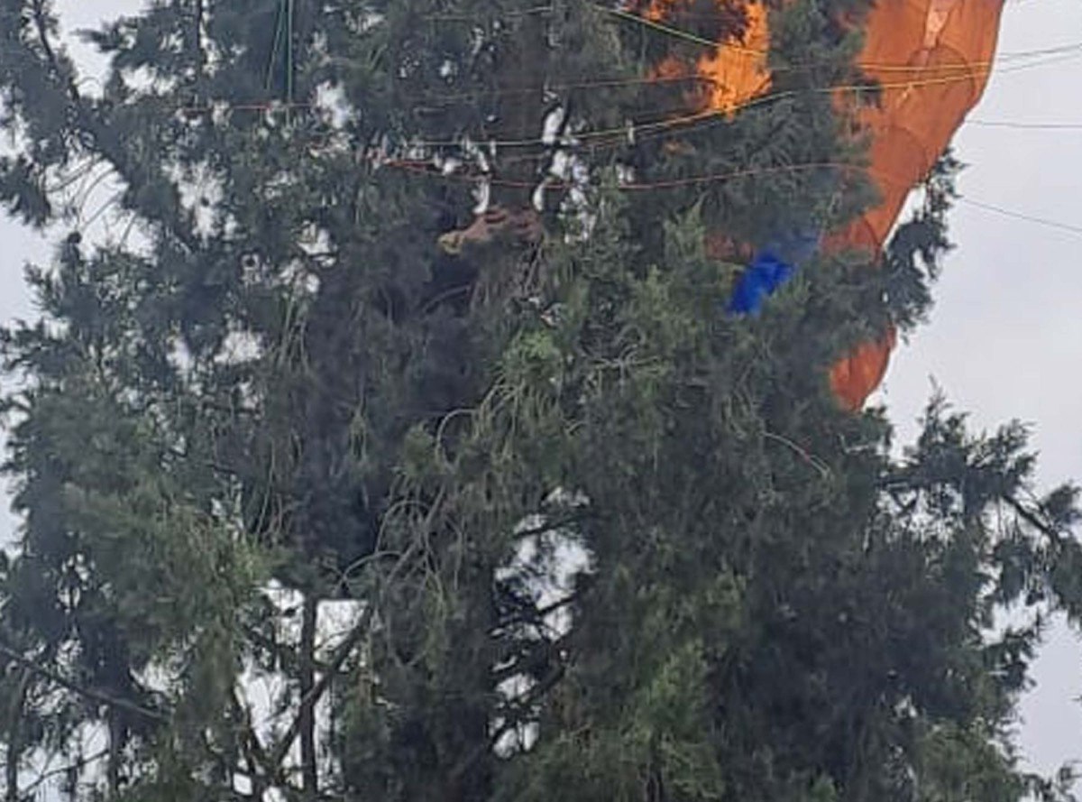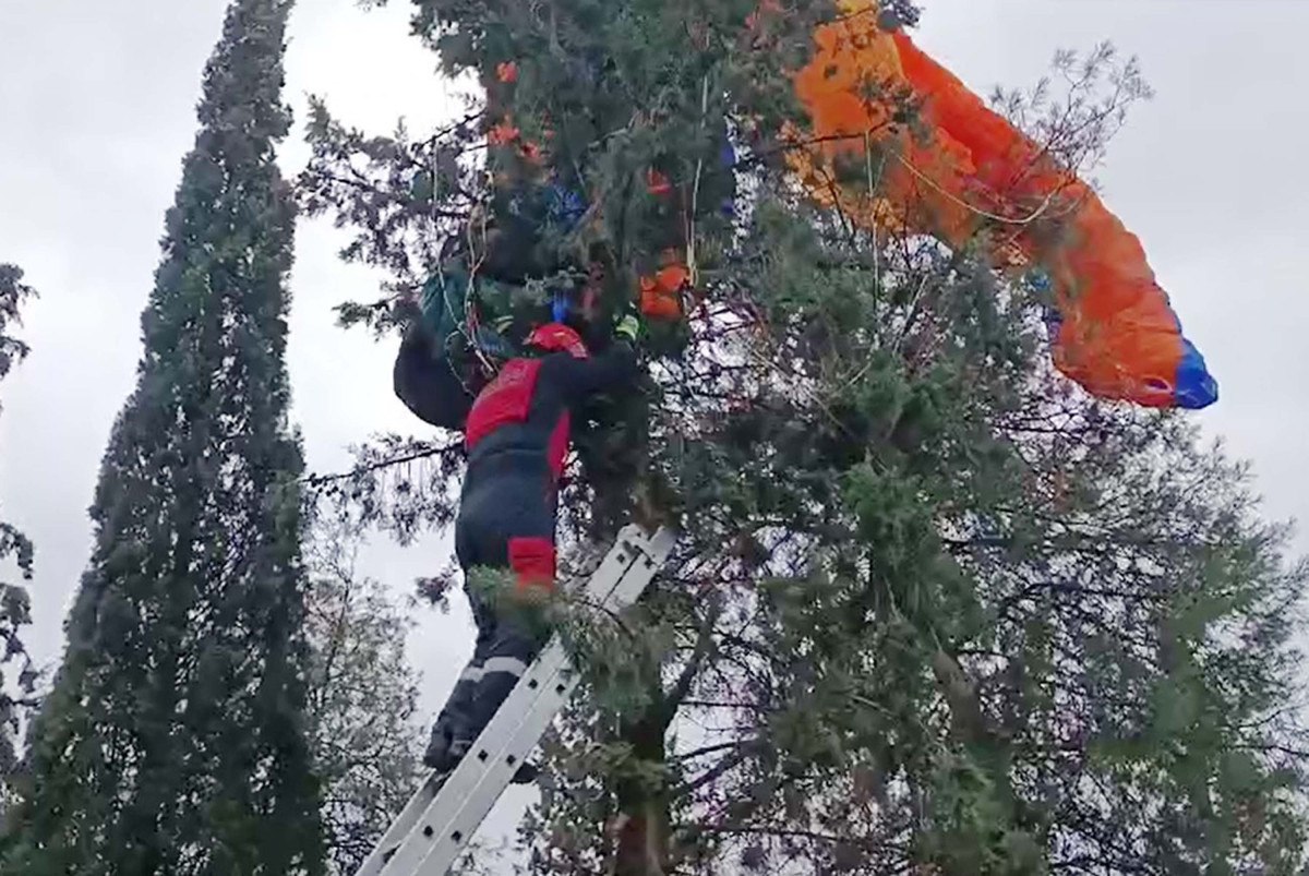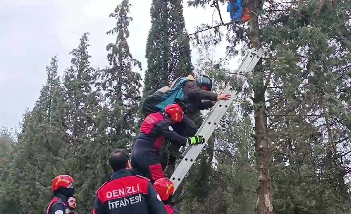 Denizli’de paraşütü ağaca takılan pilotu itfaiye kurtardı