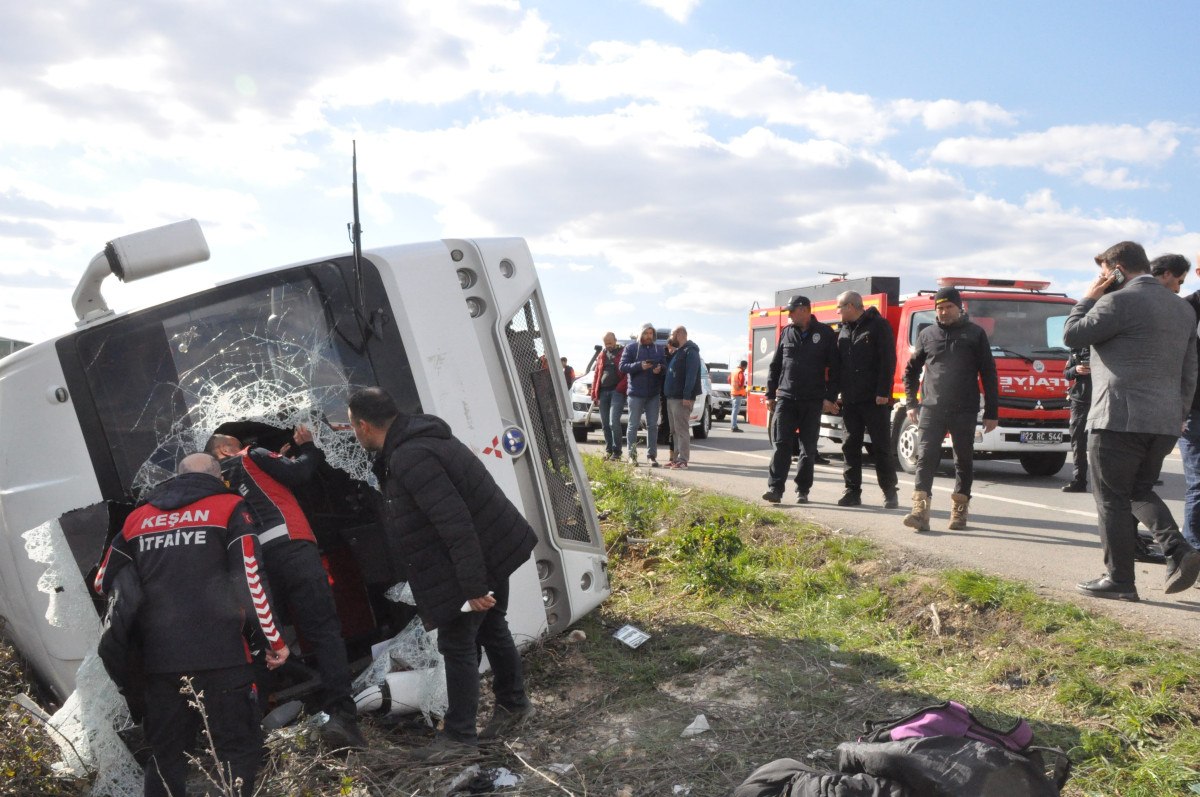 Edirne’nin Keşan ilçesinde, Mehmet Akif Ersoy Anadolu Lisesi öğrencilerini taşıyan T.D. (59) yönetimindeki 22 RF 775 plakalı öğrenci servisi, Beyendik Kavşağı’ndan Keşan yönüne döndükten kısa bir süre sonra kontrolden çıkarak şarampole devrildi.