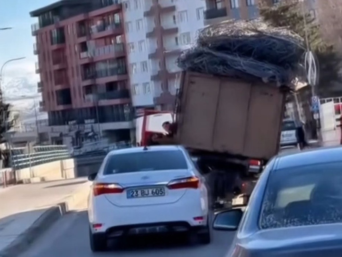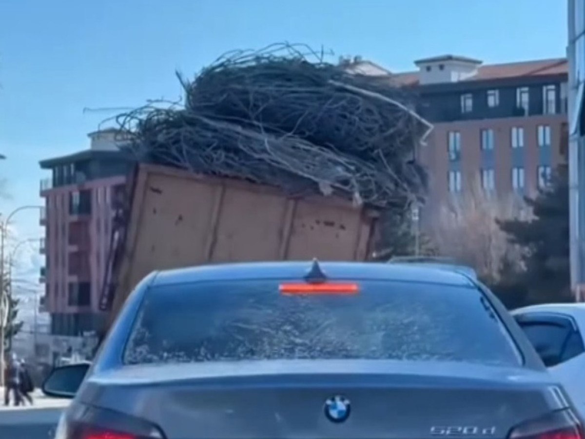 Kamyonet devrilme tehlikesi yaşarken o anlar cep telefonuyla görüntülendi.