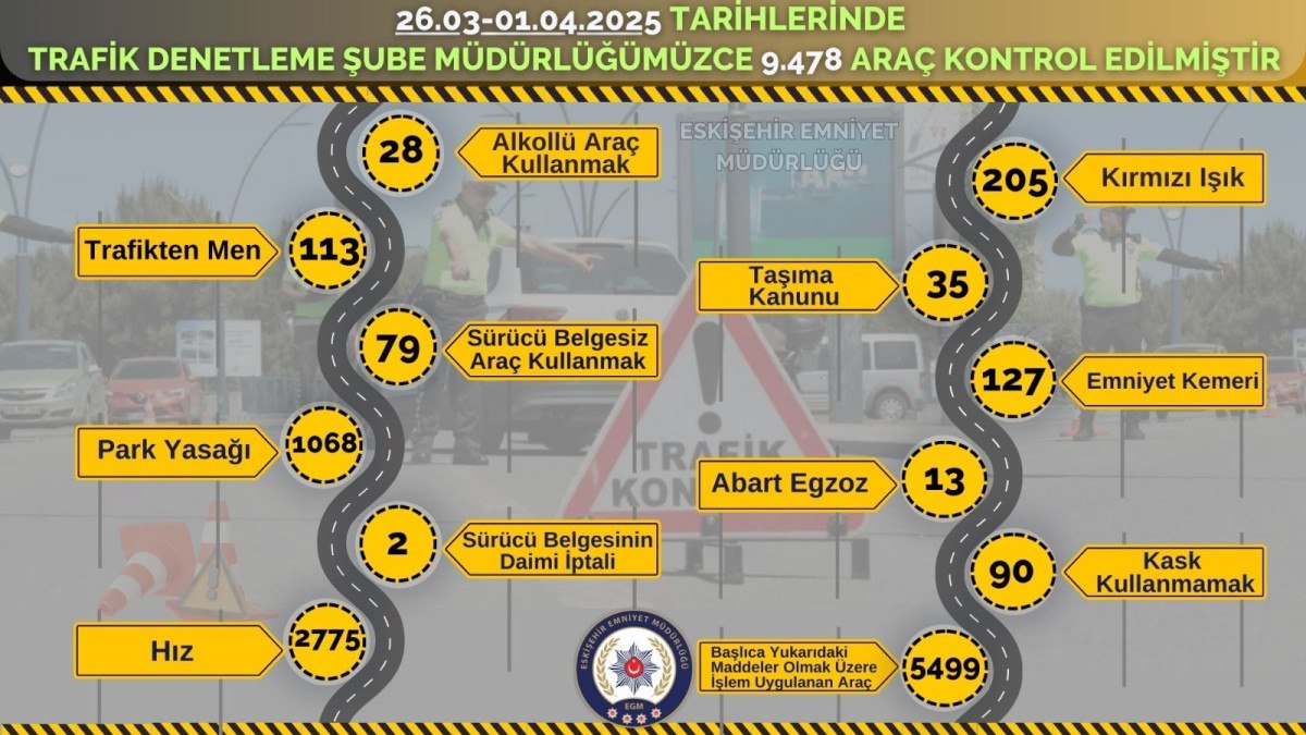 Eskişehir İl Emniyet Müdürlüğü’ne bağlı Trafik Denetleme Şube Müdürlüğü ekiplerince 26 Mart – 1 Nisan 2025 tarihleri arasında çalışma yapıldı.