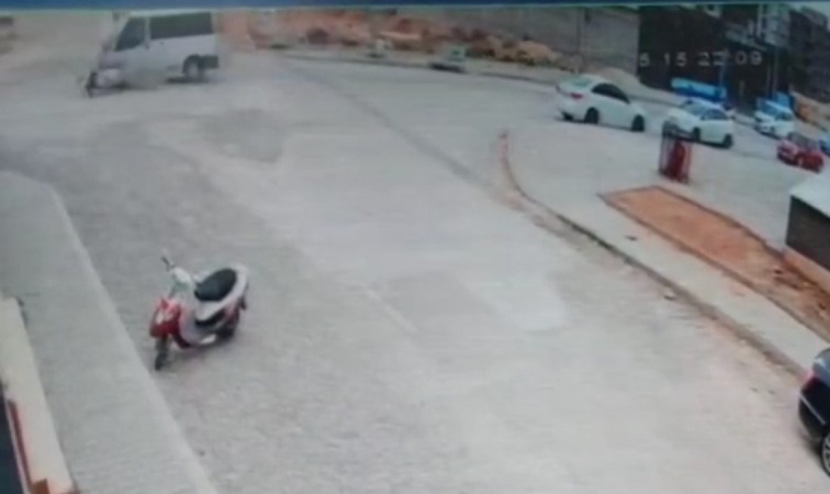 Görüntülerde, seyir halinde olan motosiklet ve hafif ticari aracın çarpışması ve motosikletin savrulma anları yer aldı.