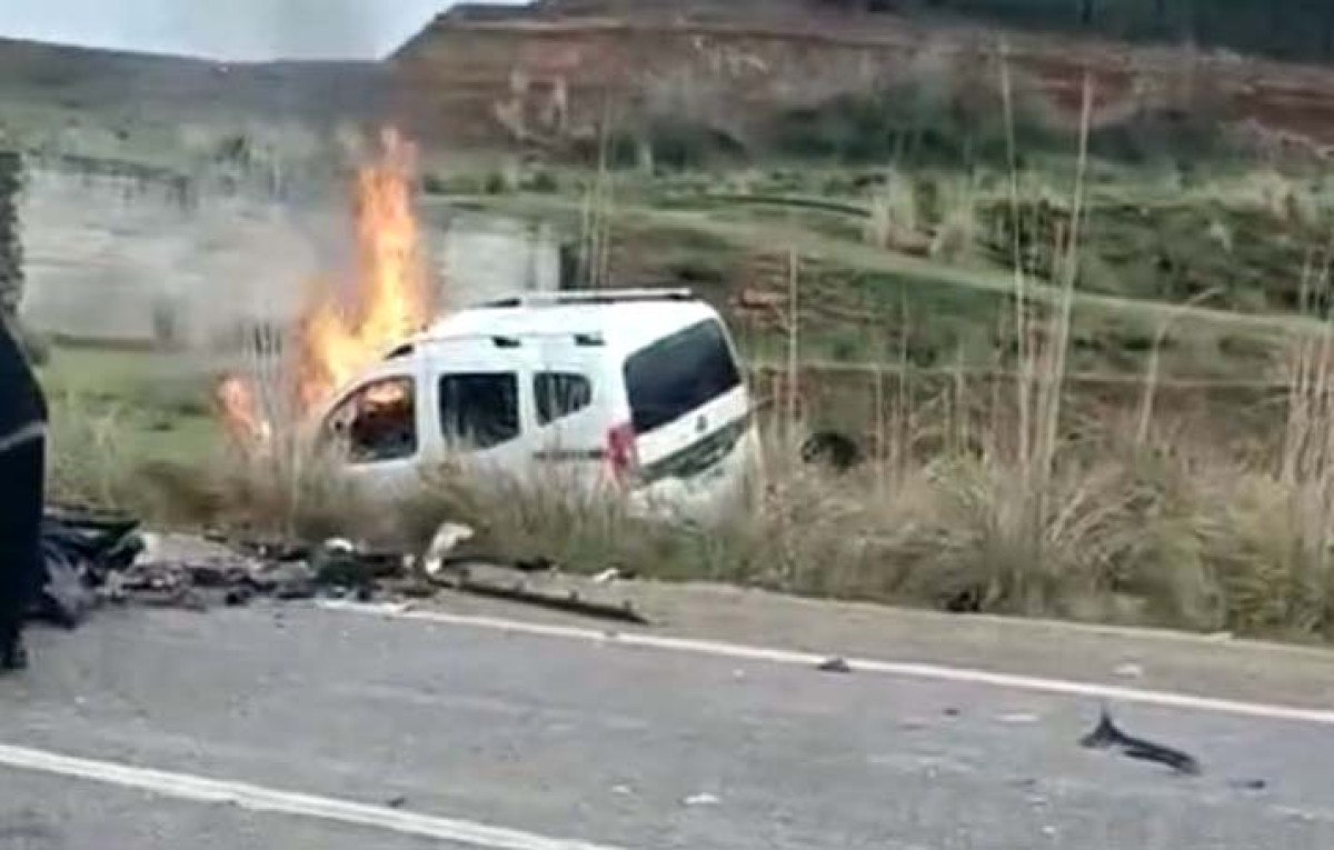 Kaza sonrası hafif ticari araçta yangın çıktı.