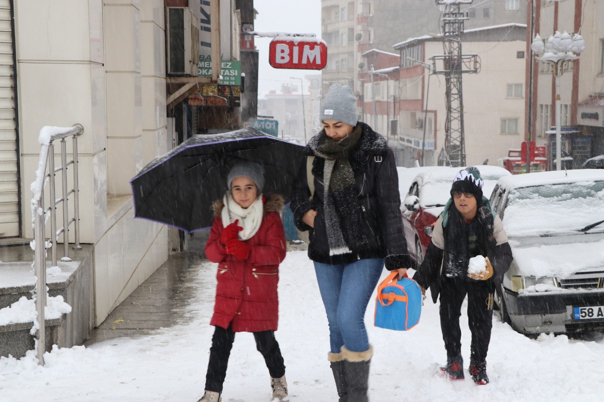 Yağışı ile birlikte kent merkezi beyaza bürünürken, sabah okullarına giden öğrenciler ve çalışanlar lapa lapa yağan karın altında yürüdü.