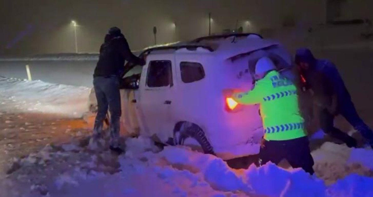 İl Emniyet Müdürlüğü’ne bağlı Bölge Trafik Denetleme Şube Müdürlüğü ekipleri, kar yağışına hazırlıksız yakalanıp yolda kalan sürücülerin araçlarını itti ya da zincir takmalarına yardımcı oldu.